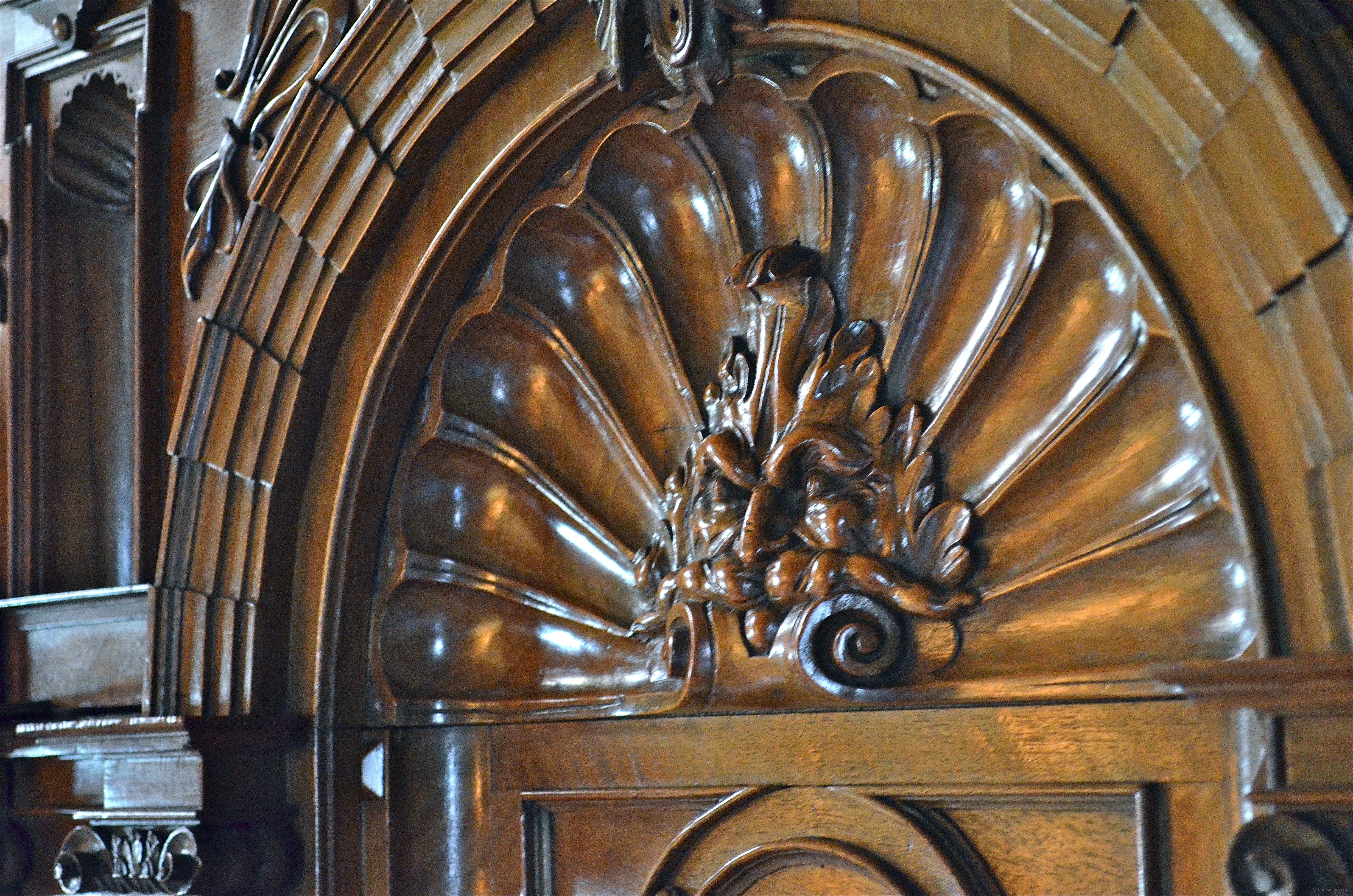 This fitted wardrobe is filled with drawers and shelves used for clothing and bed linen storage. The carvings are mixed geometric simpleness with complex freeform areas. Moustached faces are repeated throughout each section, adding a sort of wood-spirit impression. This is a fairly large piece at 12’ long and 7’6” tall.