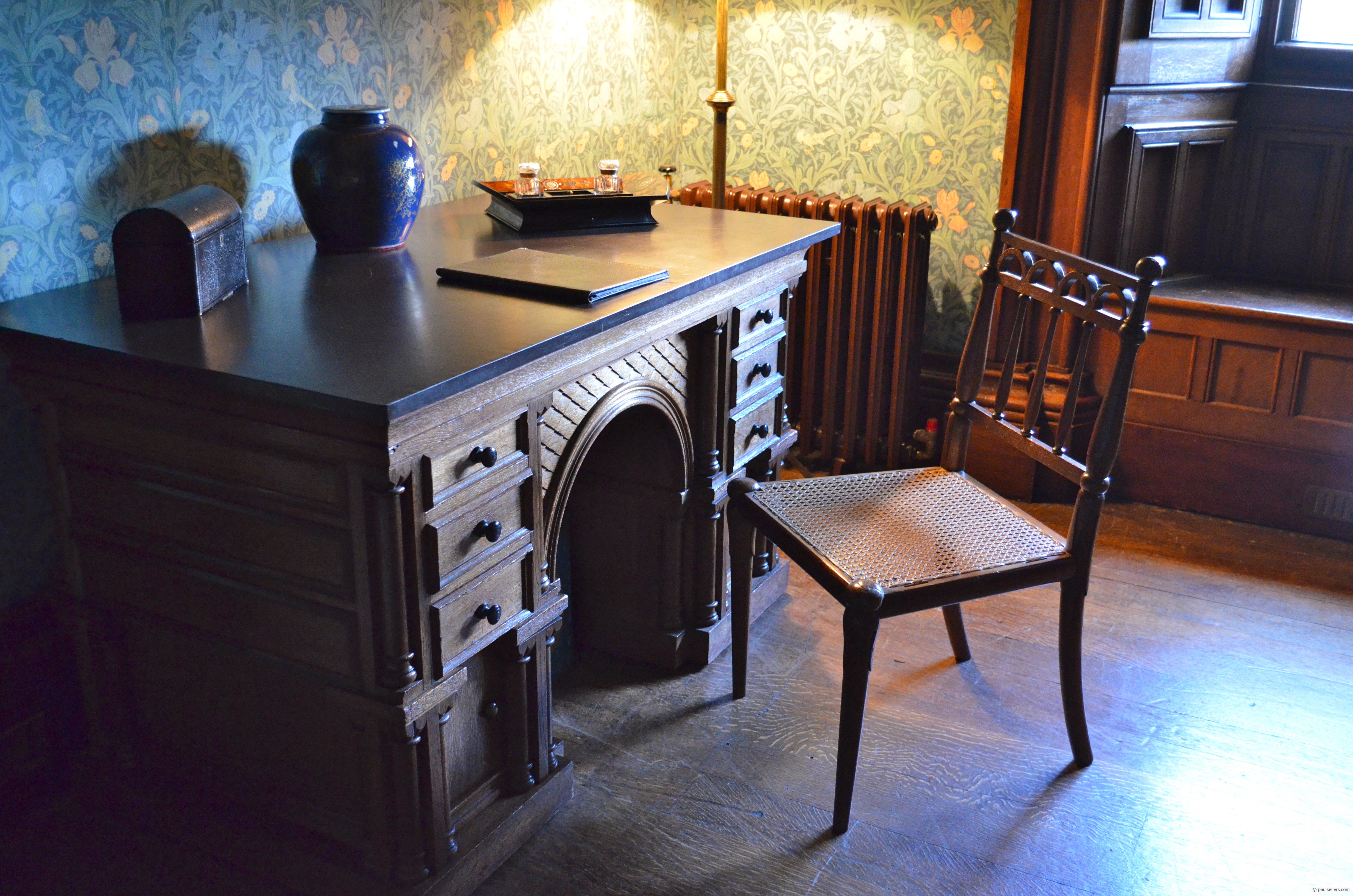 This Hopper desk seems out of place here and of course with the arched kneehole being so low, it was obviously not used in the common way. But there are aspects to the desk that I really like in that it’s a masculine desk and has a 1” thick slate work surface. The wallpaper in the background is by William Morris.