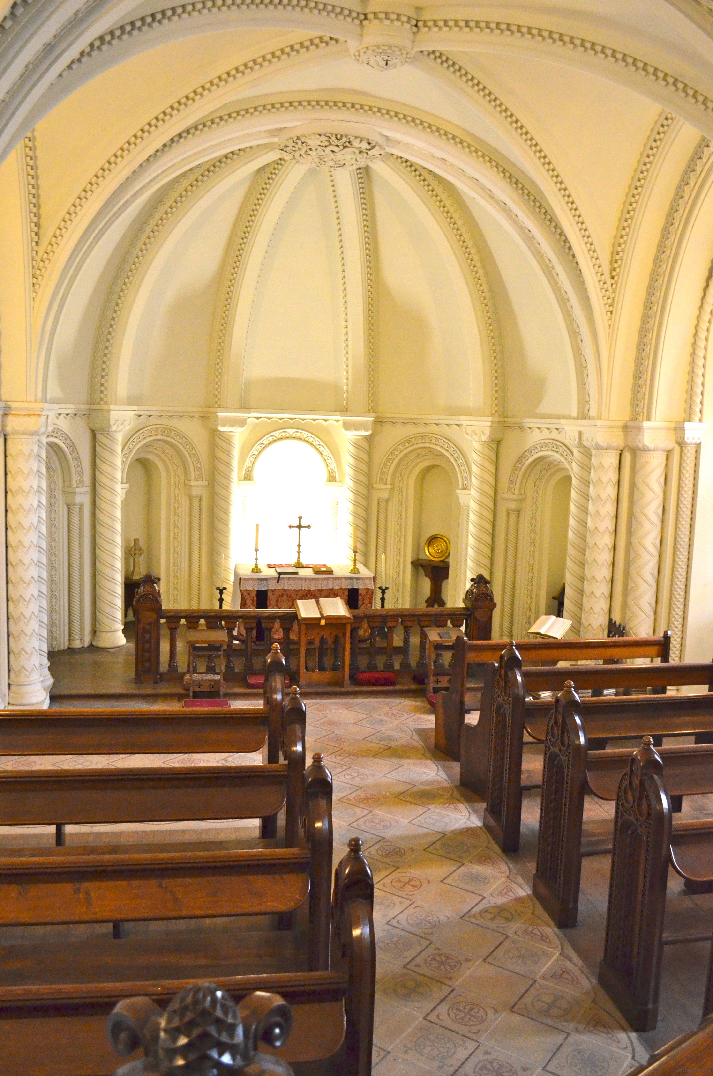 The arched ceiling in the chapel is vaulted with segmented arching supported on typical columns that continue into graceful proportions that then culminate in central rosettes. Arched windows and doorways and recesses further define the arching.