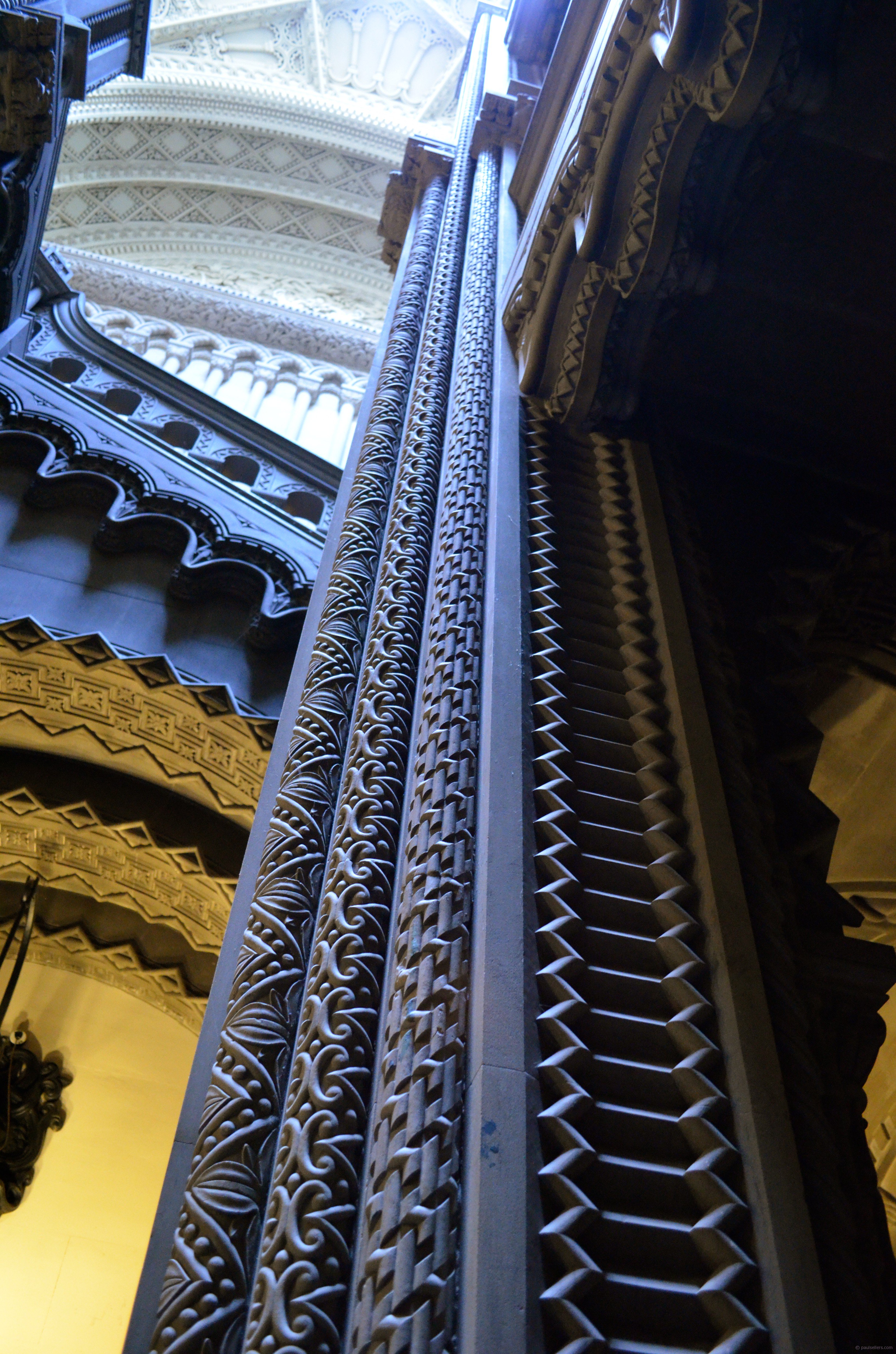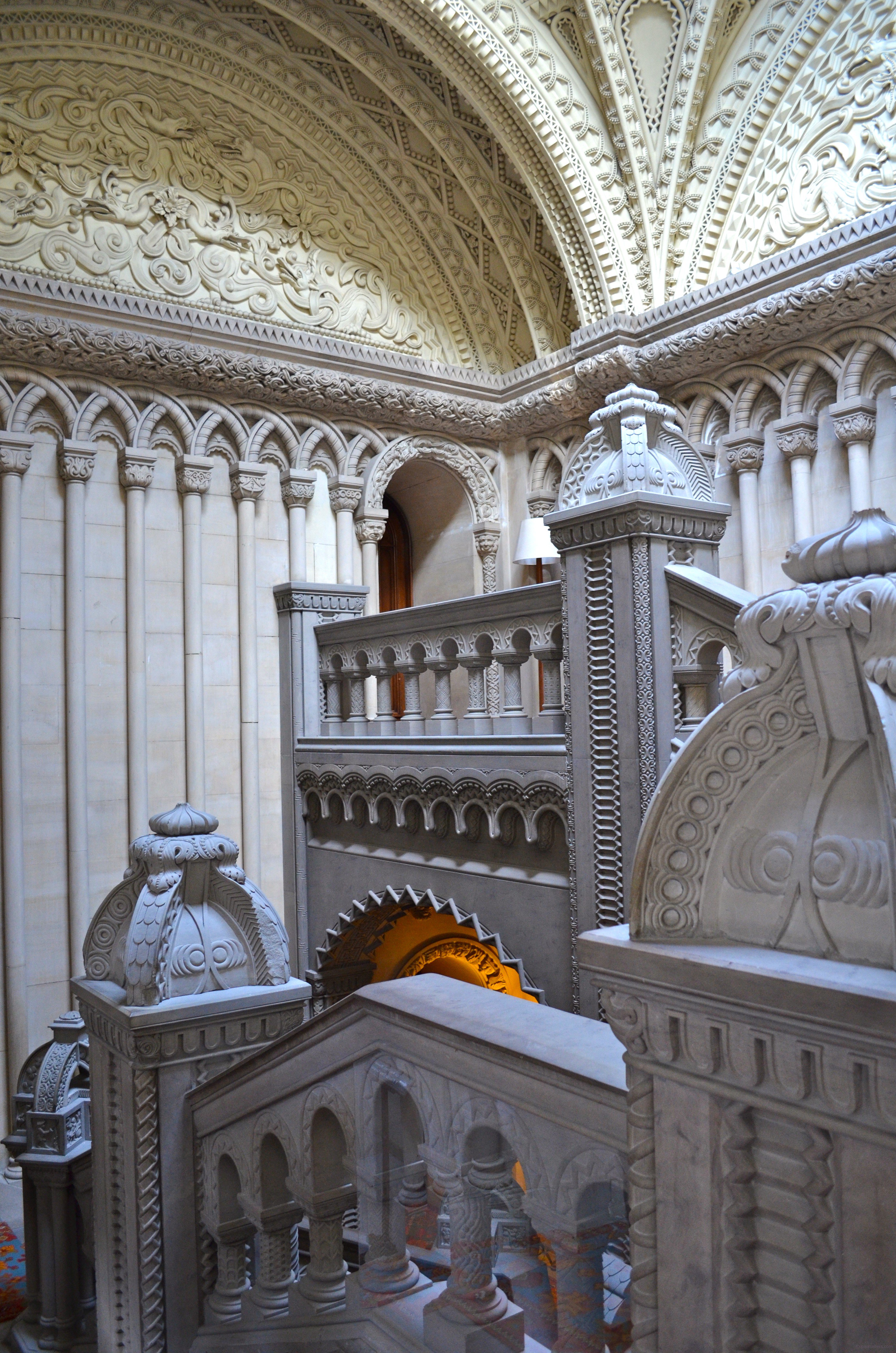 These complex carvings to the pylons, newels and balustrades give weight to effect a spectacle for visitors as they pass through the different levels. Carved from solid grey sandstone and limestone, I was impressed by the sheer accuracy of the stone carvers, but then looking aloft to the upper balustrades and ceiling panels, I couldn’t help but wonder if this wasn’t the absolute peak of artisanry in the precision of each steel chisel that carved such pristine work.