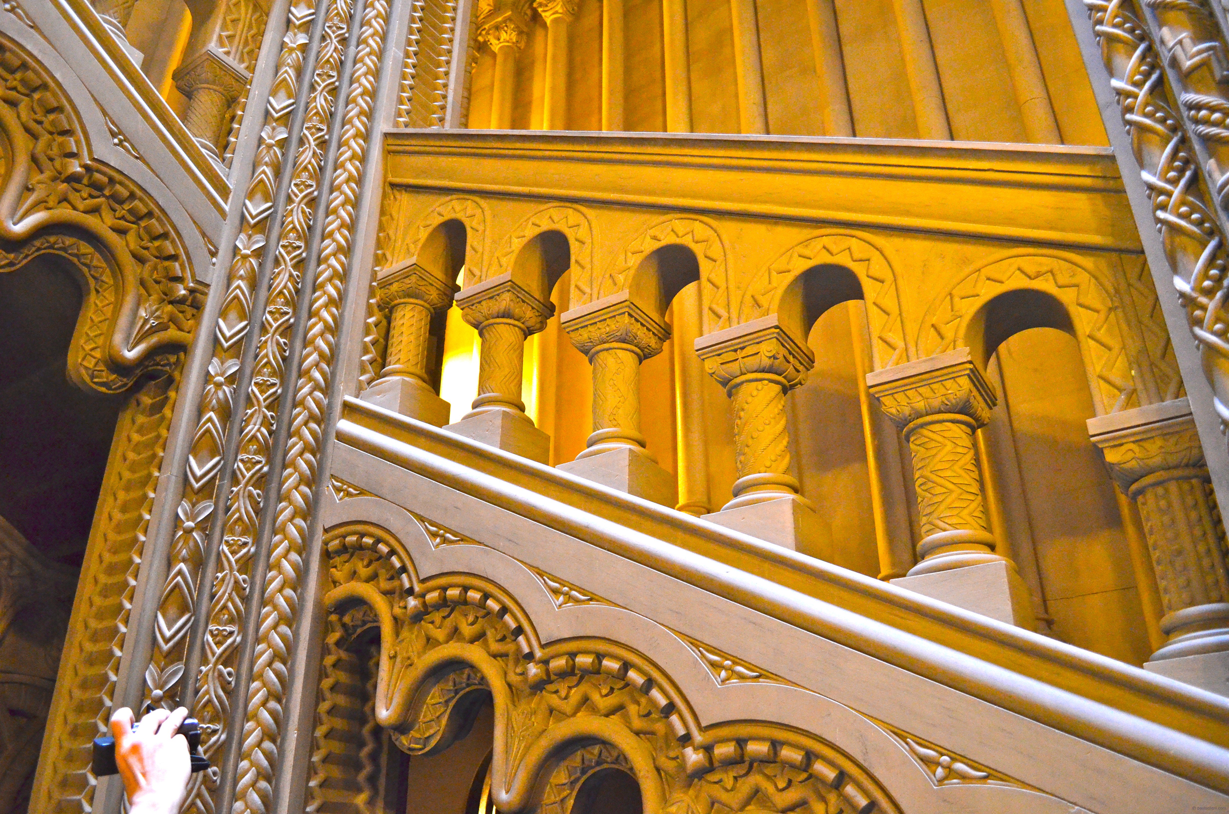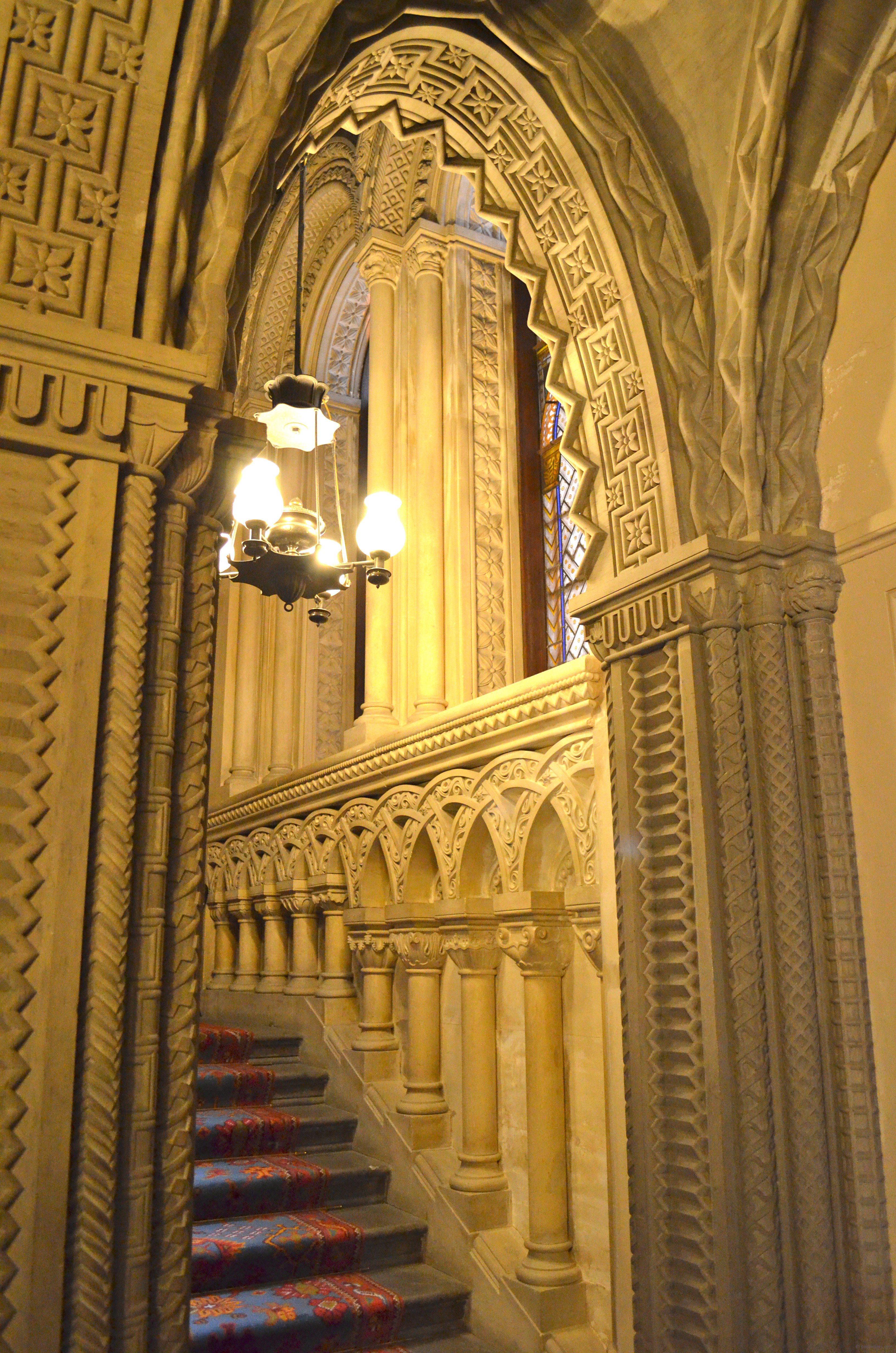 The neo-Norman style continues as the theme despite difficulties in Norman styling unsuited to this stairway. The expanse of diverse carving serves to embellish what is a particularly small footprint for a grand staircase. This gives the both impression of grandeur and practical step configuration resulting in landings and tread heights perfected to within 1/16” of each other.