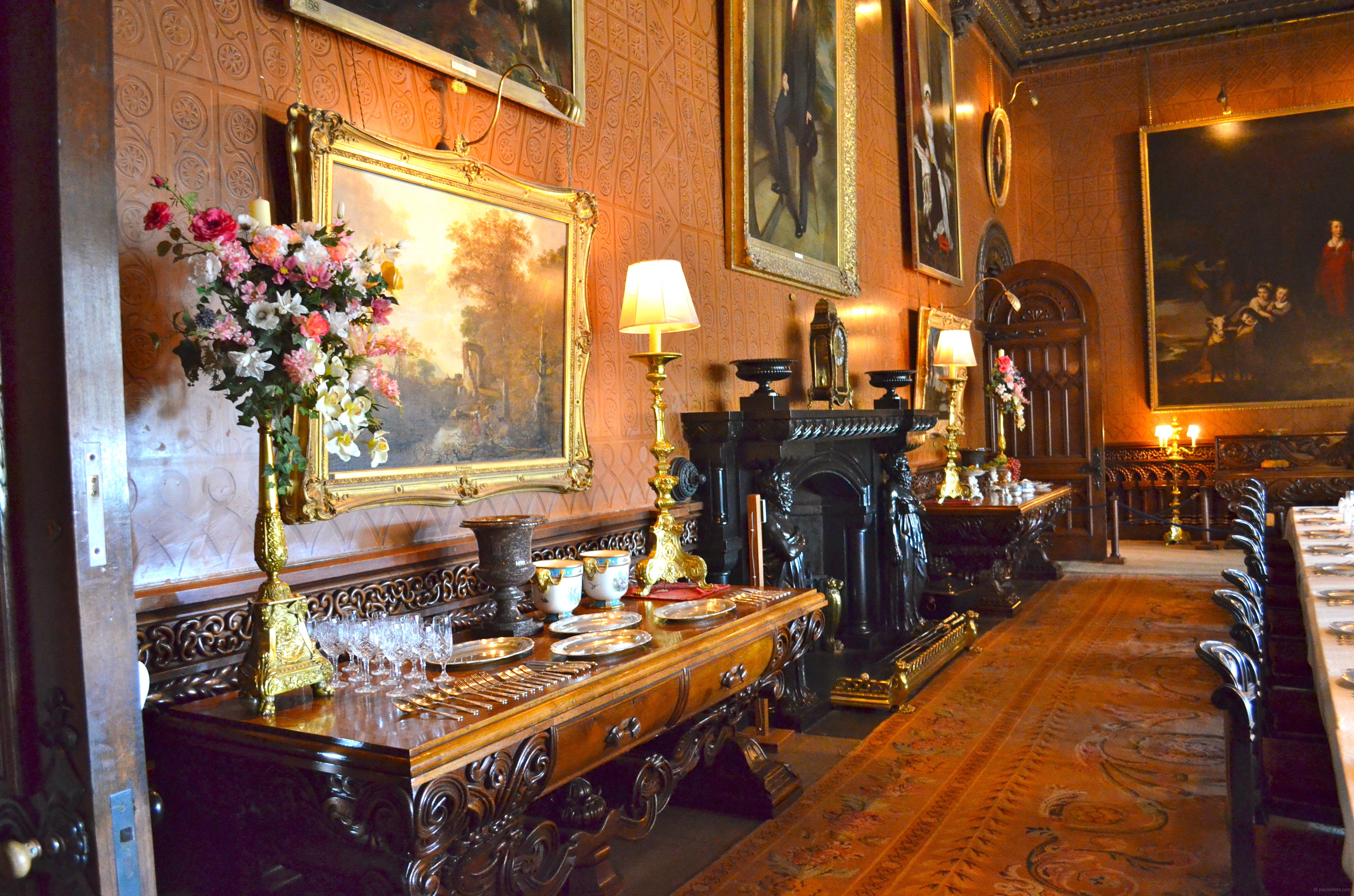The huge walls are covered in Old Masters as you can see and they alone are worth glimpsing as they depict so much of the past as a record of affluent life in the early to mid 1800’s. The chimney fireplace is impressively carved from highly polished black Penmon Limestone. Very detailed depictions of two classical Roman figures.