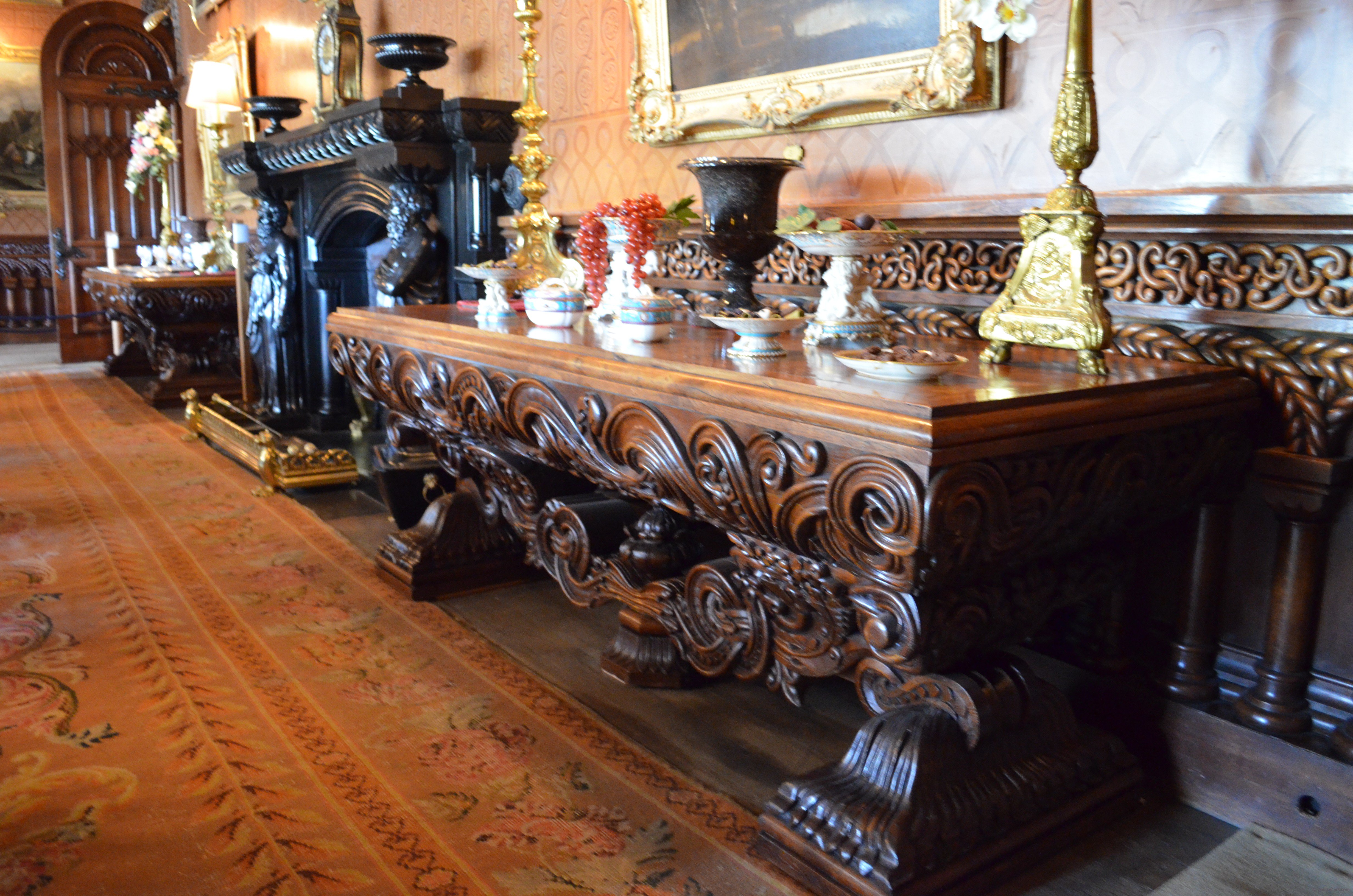 These large carvings flow in remarkable scrolled curves to create of diversely carved and shaped frieze work. This changes form but remains a continuous dado area around the whole dining room. Though it’s not so simple as the earlier work in that the convolutes and shapes add complexities not expressed in the more repetitive and orderly at the beginning. All of this work is still time consuming and tedious, whether free- or repetitive pattern. My examinations reveal the same oversight by the master carver. The carvings in the sideboards and the dado areas are again very masculine, less suggestive but symbolic to the hierarchy and structure of the era and Pennants dominion in the region of a world visionary and entrepreneur.