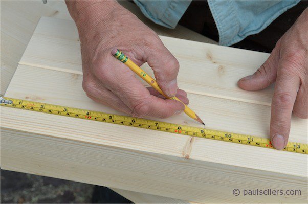 First, with all of my legs cut exactly to length, I measure up from the bottom of the leg 9” and make a mark. I place the pair of legs together, flush the ends and square the line across both legs.