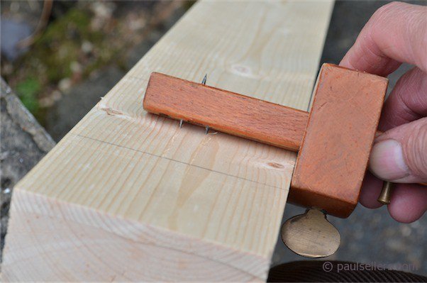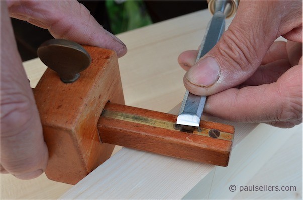 In this case I am using my combination square set to 1 ¾”. I could just as easily use a rule and run the parallel line with my finger setting the distance for the pencil line. Here I am showing both the marking with the combination square and then with the mortise gauge.