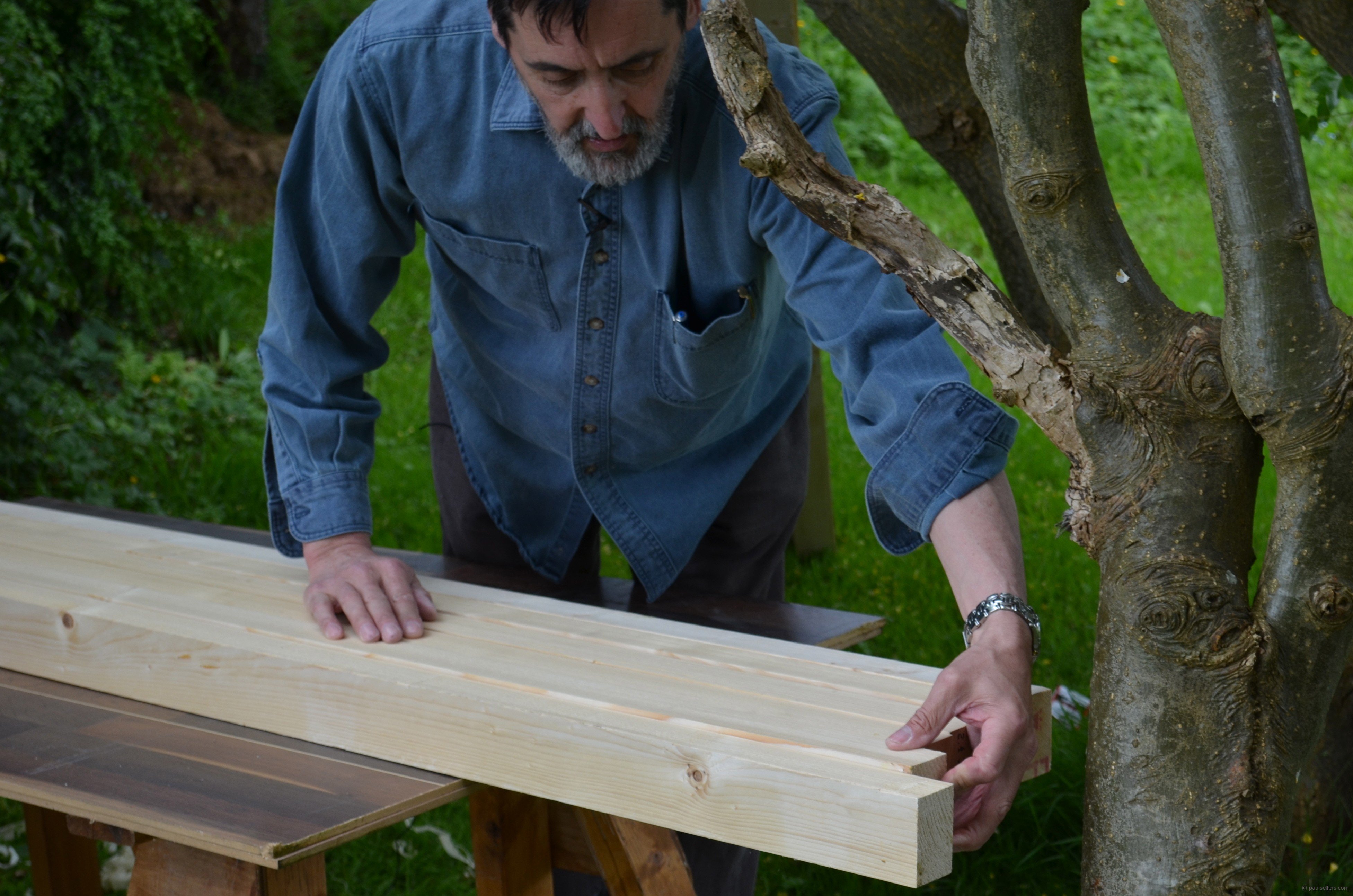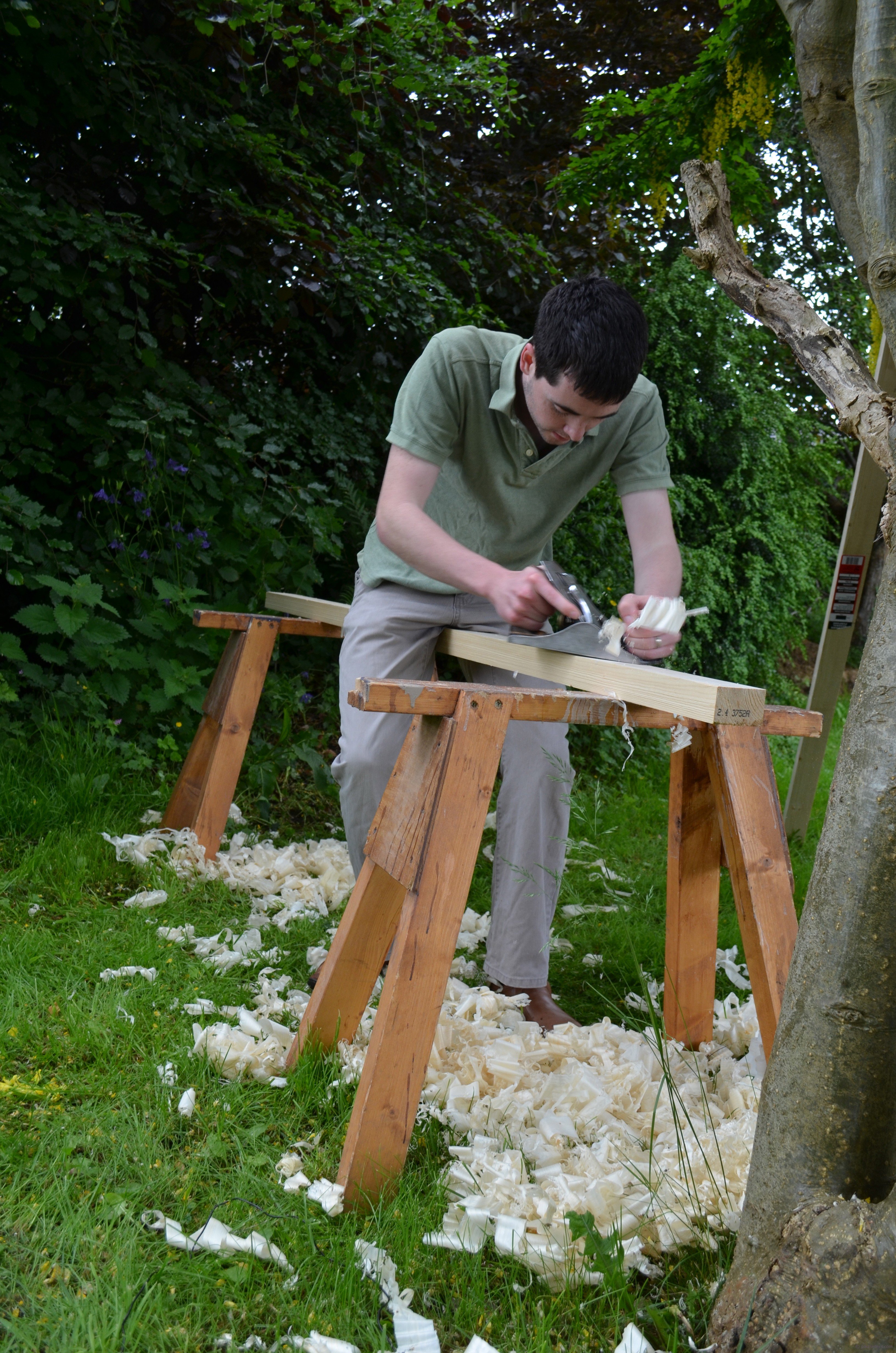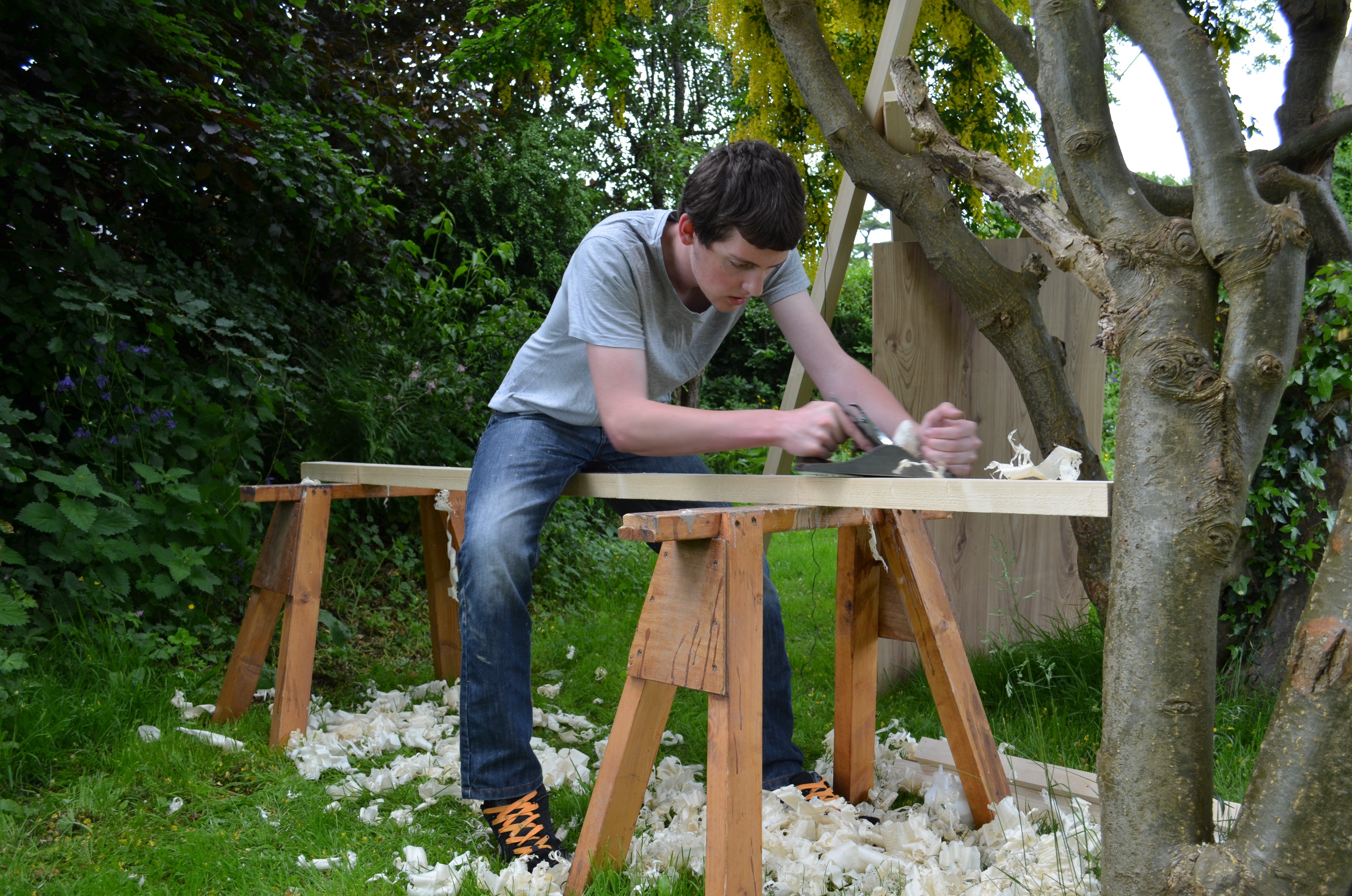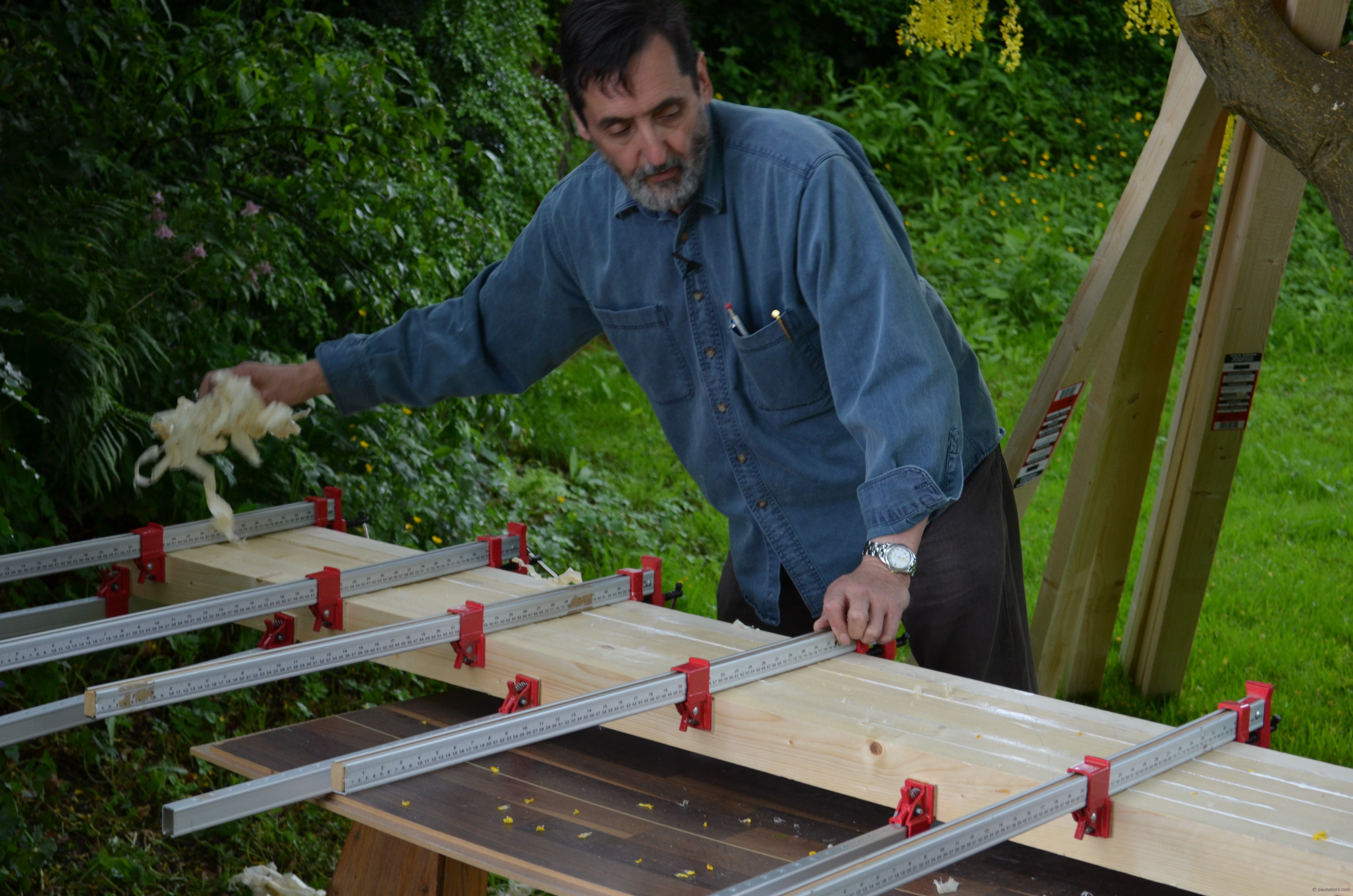 We used a laburnum tree to push against and I think it took the three of us about an hour to surface plane the large flat faces ready for gluing up the laminated tops. This was fun even though rainclouds hovered overhead the whole time.