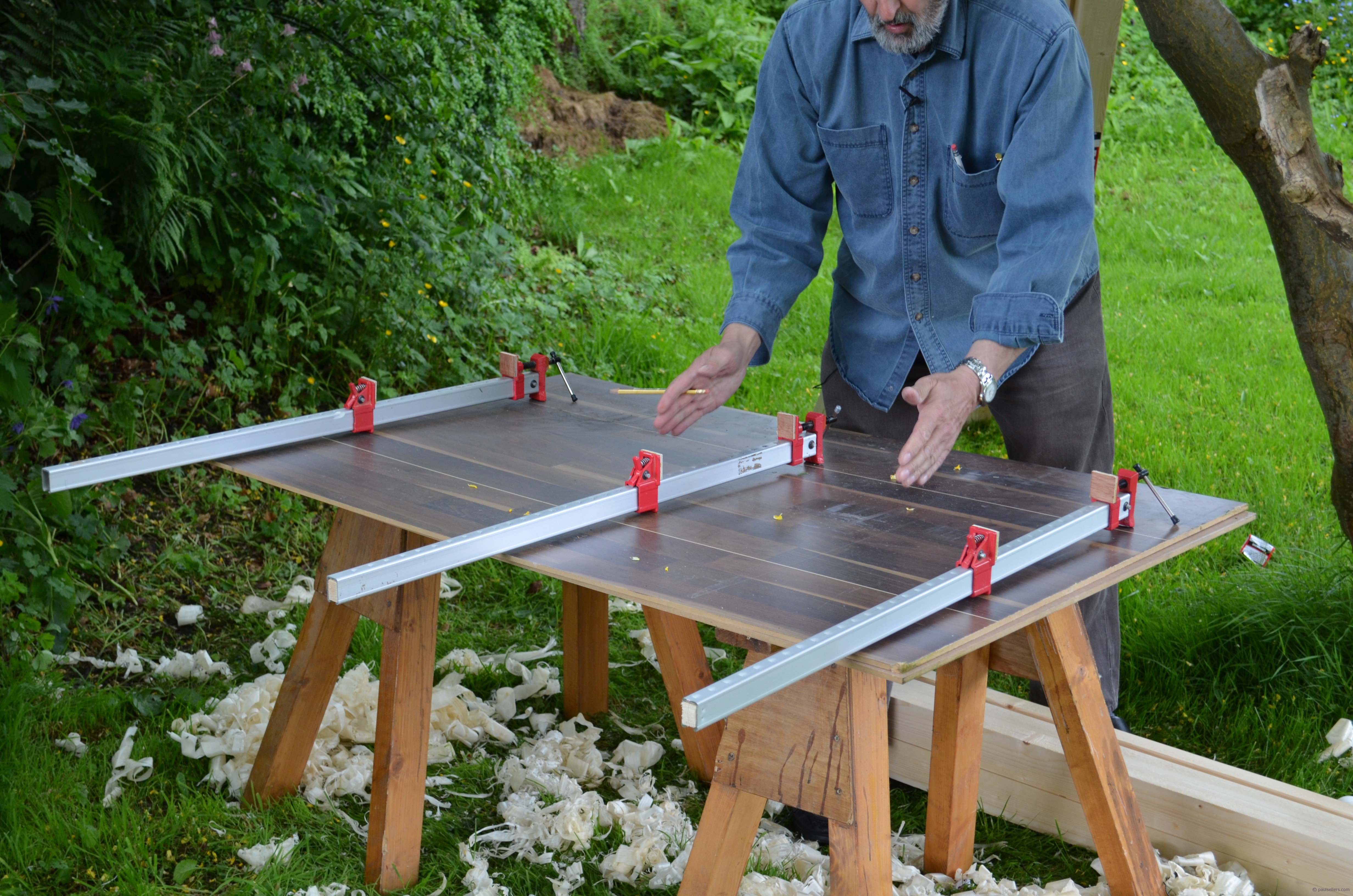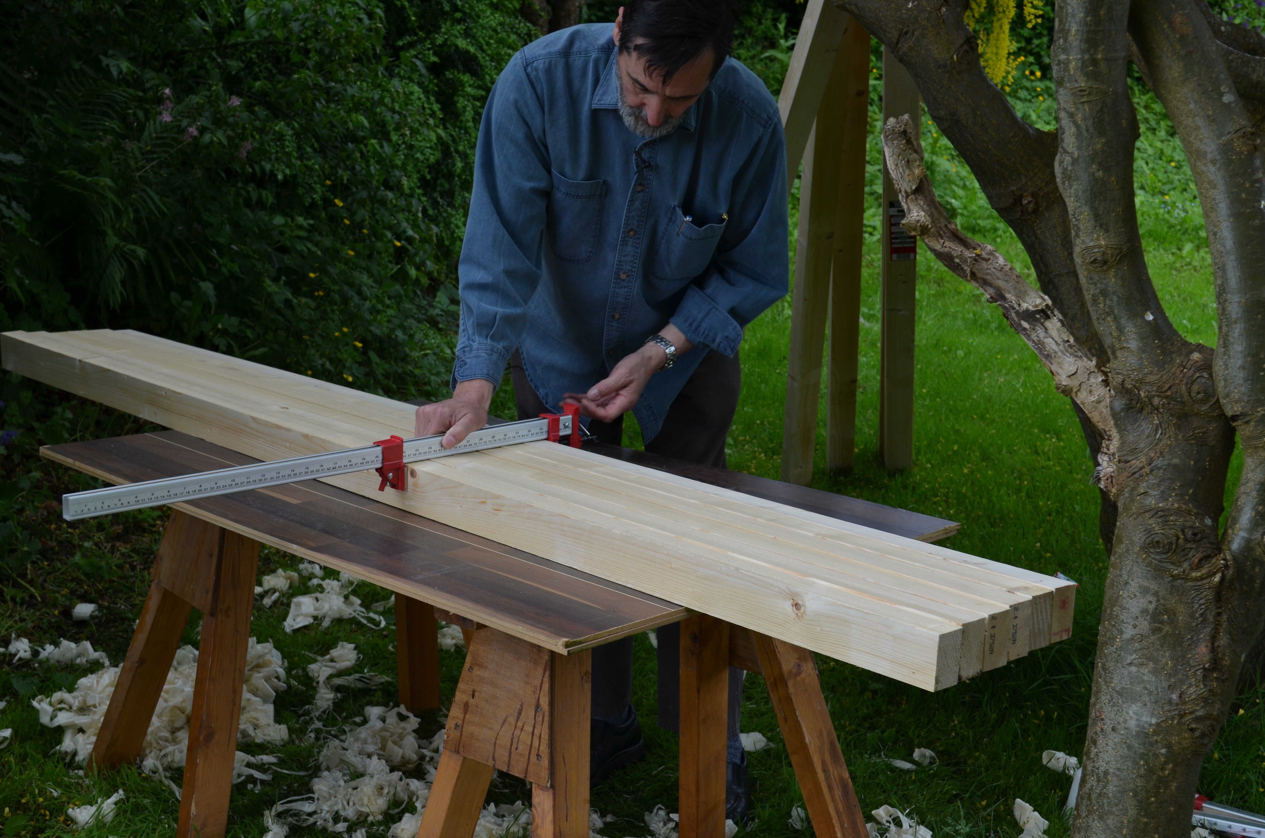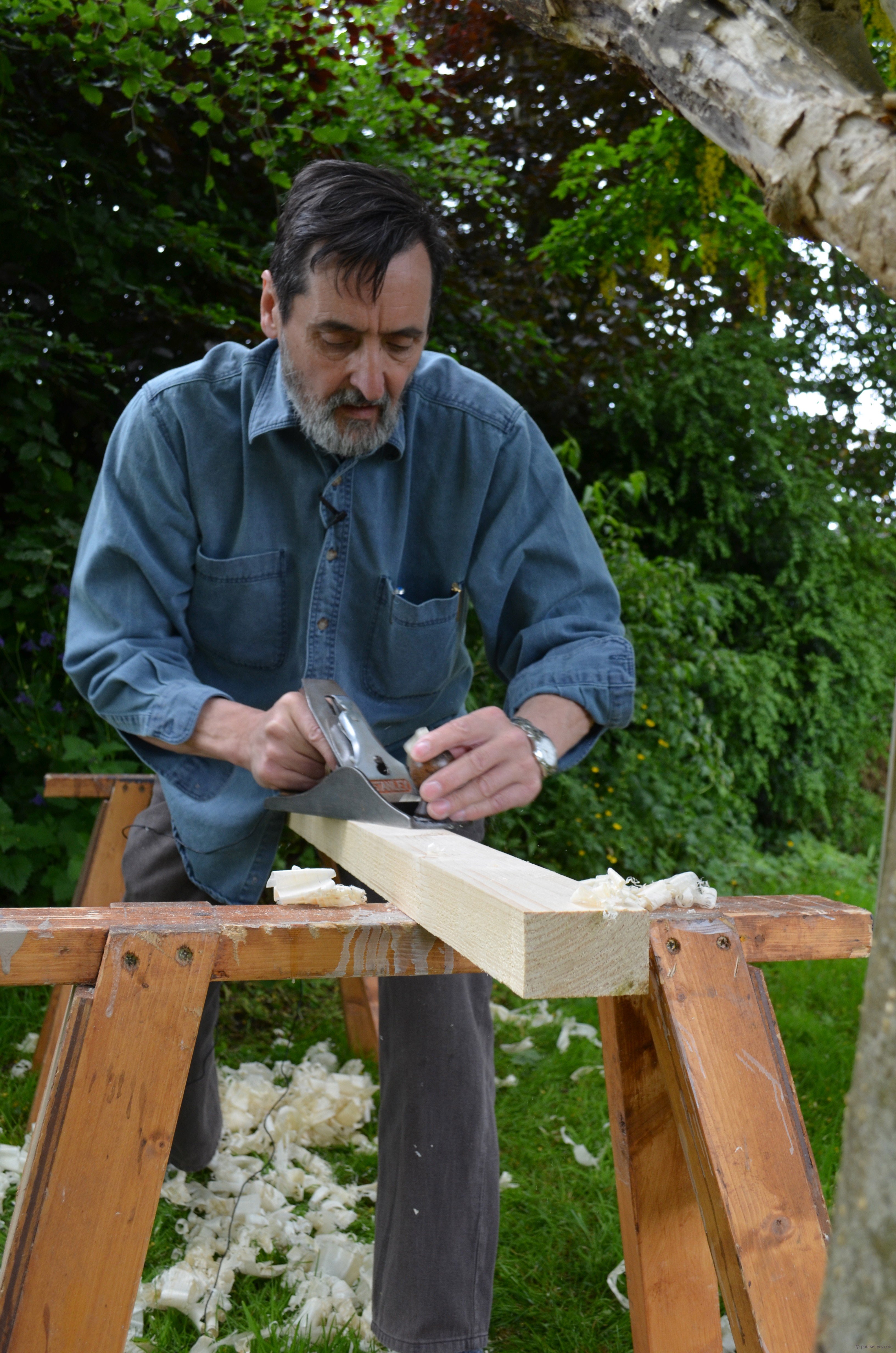 As you know I do have beautiful workshops to work in and teach from, but making your bench presents several challenges not the least of which are planing, sawing and jointing the various components and then assembling the units as you develop the bench. That being the case, I am working in my own back yard (American for lawned garden) for the development of the whole bench. This is going to take a few days because of my commitments but it will be worth it. In my earlier blog you saw me picking the wood from the racks. Again, it is unreal to think that you have access to a sawmill and machines to mill your own. You must work milling sizes out for yourself. I know in B&Q and Home Depot or Lowes, you can find wood that is around the sizes I am using and so you must sort through that for yourself. If you have machines, all the better. And remember, no matter what anyone tells you, a machine is NOT a tool, it’s a machine. A tool is powered and directed by you and responds to your senses. All machines were developed for mass manufacturing so no matter which editor or author tells you differently, a machine is a machine.