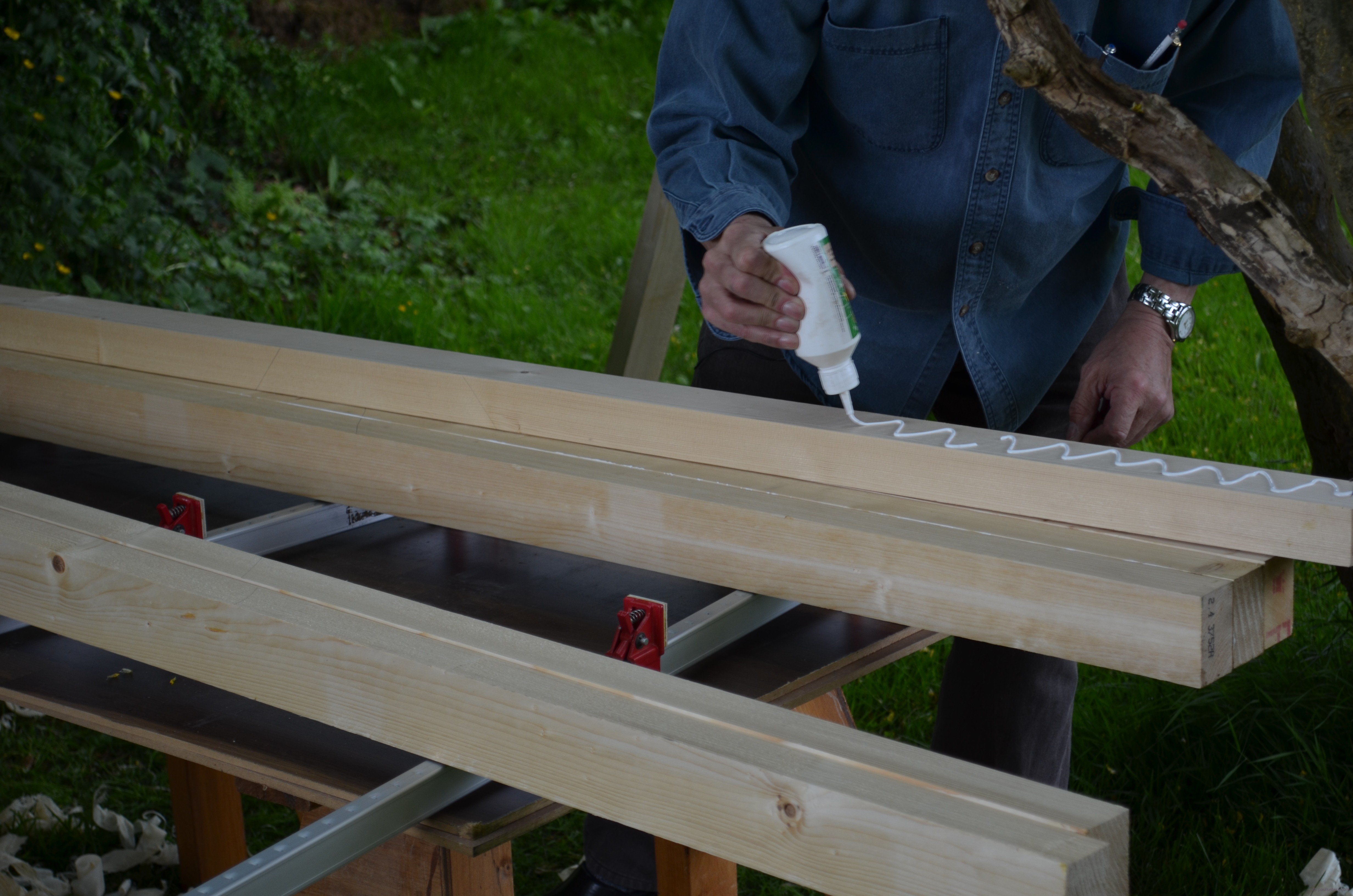 Notice my clamps alternate between top and bottom or underside of the laminations. This ensures even pressure across the width of each laminated piece and thereby even squeeze out of excess glue. You will need a minimum of 11 clamps but perhaps if you don’t have enough you can borrow them. Even pressure along the whole length is important.