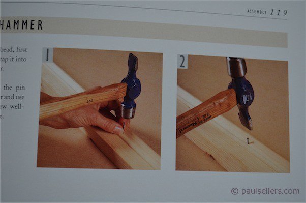 The authors show a small cross-peen hammer driving a panel pin (finish nail US) and states that to start the nail you use the face of the hammer “and then use the tail of the hammer and a few well-place blows to drive the pin home.” Now I don’t know how good the authors are at driving nails with the cross-peen aspect of a cross-peen or Warrington hammer, but I would like to see the “delicate bead” when done.