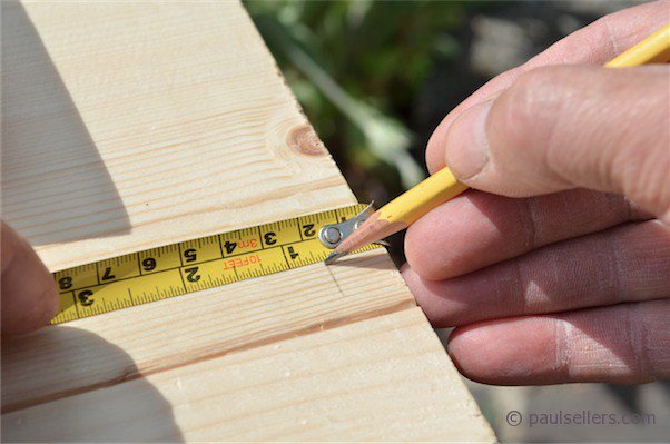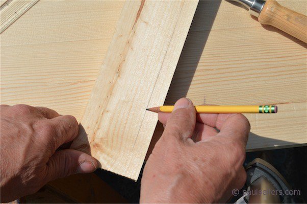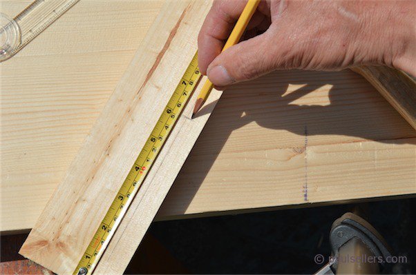 First I ran a parallel line 5/8" in from one edge to guide me and then measured 6" along from one end for cross hairs for the point of my auger bit.