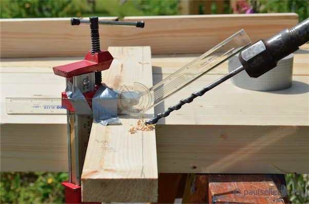 I bored 6” from the end of the wood and 5/8” in from the top edge corner.