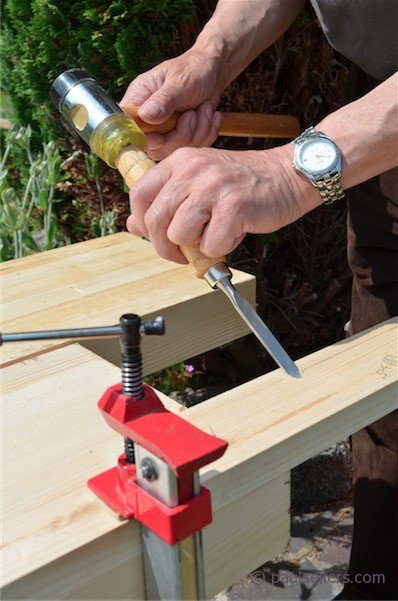 To get the right depth, or near to, mark your depth of cut onto the edge of a piece of wood and tap until the chisel protrudes through to where you need it as shown. For trimming tenons, tap through and test on the actual work. The idea is to take of small increments in depth and by tapping the chisel handle you can get the exact depth you want. To retract the chisel and lessen the depth, tap the back, upper corner with the hammer. It is trial and error but surprisingly quick and accurate with a little practice.