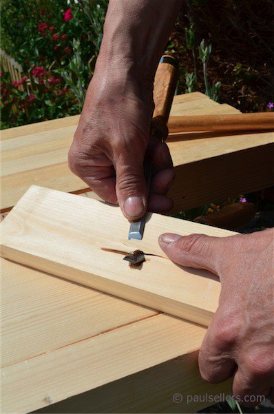 With the hole bored, place the cutting edge of the chisel near centre to the hole and angled to correspond to the pitch of the bored hole. Drive the chisel into and through the hole.