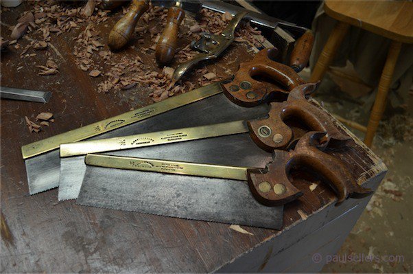I have many different tenon saw types made by makers from the USA and England. I have used some from other European countries, but have not found the quality or a history for making fine tenon saws. Whereas Henry Disston (nothing to do with modern-day Canadian Disstons, which have made extremely low grade handsaws since the 60s) made the finest tenon and handsaws, one of the best makers I have enjoyed the work of is Robert Groves who started making saws in 1770. I have owned one 14” tenon saw for over 30 years and have accumulated the three more you see here to complete my collection. Now I don’t want to cause conflict, but when I say collection I am talking about user tools not shelf sitters and backdrop images to conjure up impressions of being a woodworker.