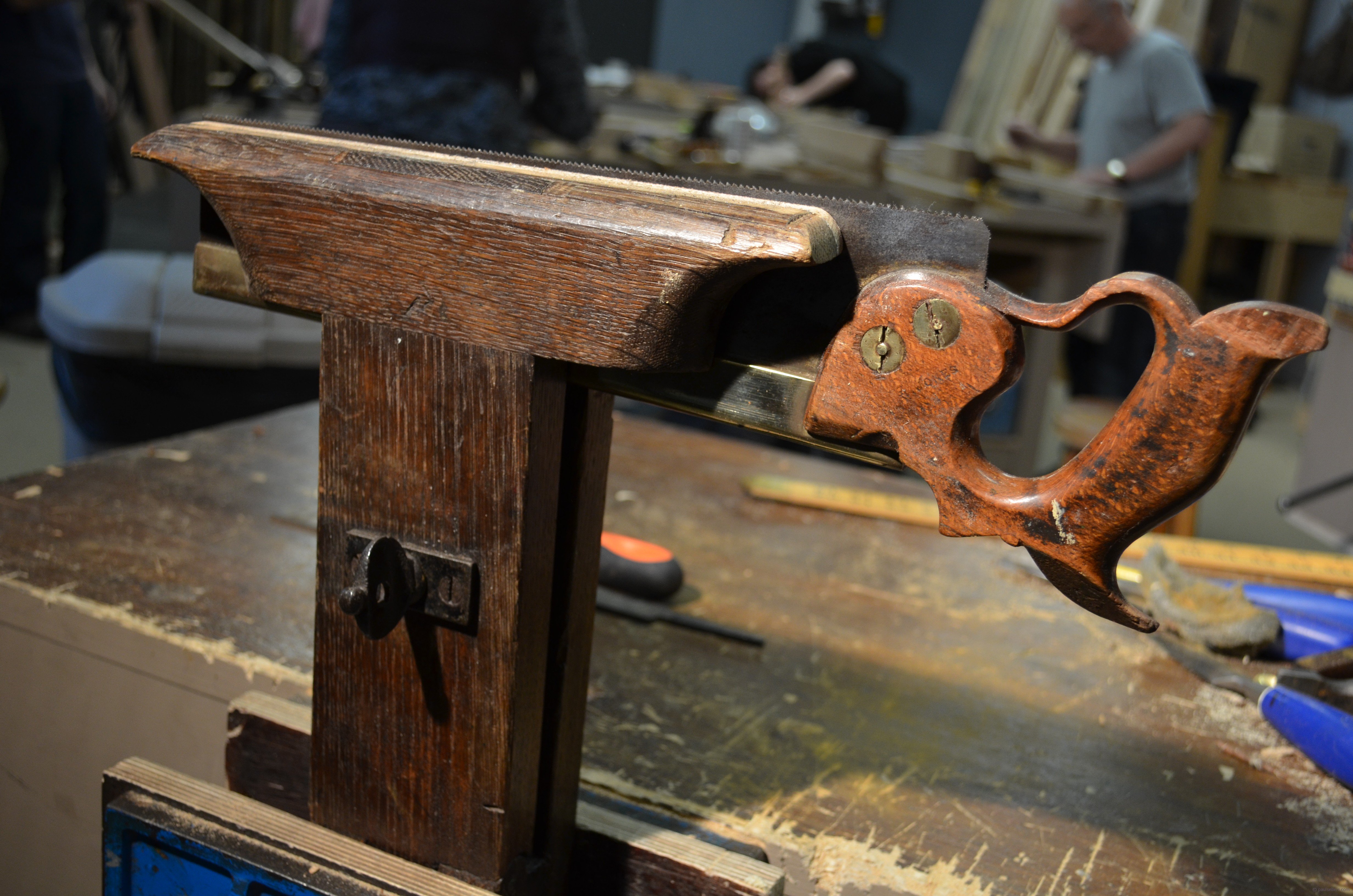 I also found the very nice old 12” brass-backed Garlick tenon saw with a couple of flawed horns to the handle you see in the vise above. The repairs were simple enough and I would have another great saw for my personal use. The price was £8 so I can’t complain at that. I bought half a dozen mixed handsaws including some S&Js and Disstons in great shape for £6 on average and a load of bits and pieces including an Eclipse saw set.