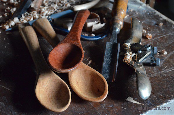 Yesterday I spent the afternoon carving spoons and spatulas and talking to people in our Penrhyn Castle workshop. Today I made wooden cutting boards from oak today, too. Adults come through my workshop, 4 years ago we had 350,000 visitors to the castle, so that’s quite a few. Anyway, seeing a man take a piece of scrap wood from an old cupboard long gone and carve a spoon means something to them. Because my life is real, somehow it conveys a stability they may have never seen before today. Their nostrils fill with the essence of wood for no machine breaks the quiet of my hand tool sphere of work and they seem suspended in a sort of momentary awe as they wander between the furniture pieces and the displays of work.