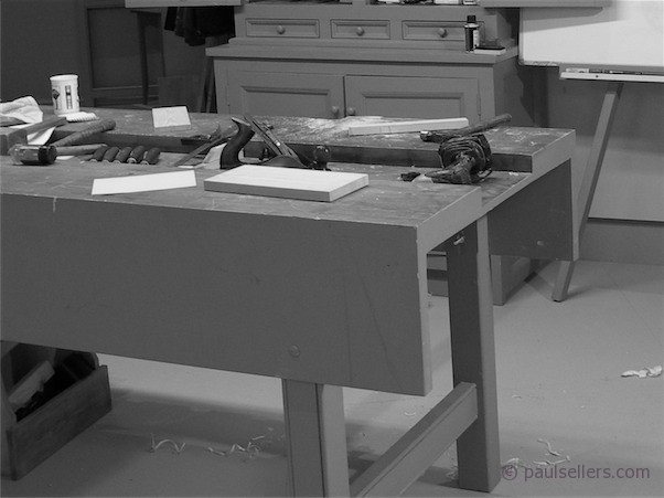 The well allowed for the majority of tools to remain on the bench but out of the way of work in progress. Joinery, no matter the woodworking craft, generally runs along from left to right of the craftsman, so there is little need for solid wood across so expansive an area. Mortises and tenons, housing joints and so on can be readily worked from left to right or right to left easily and fully accessible with the tools close to hand in the well and free from the risk of rolling or falling from the benchtop.
