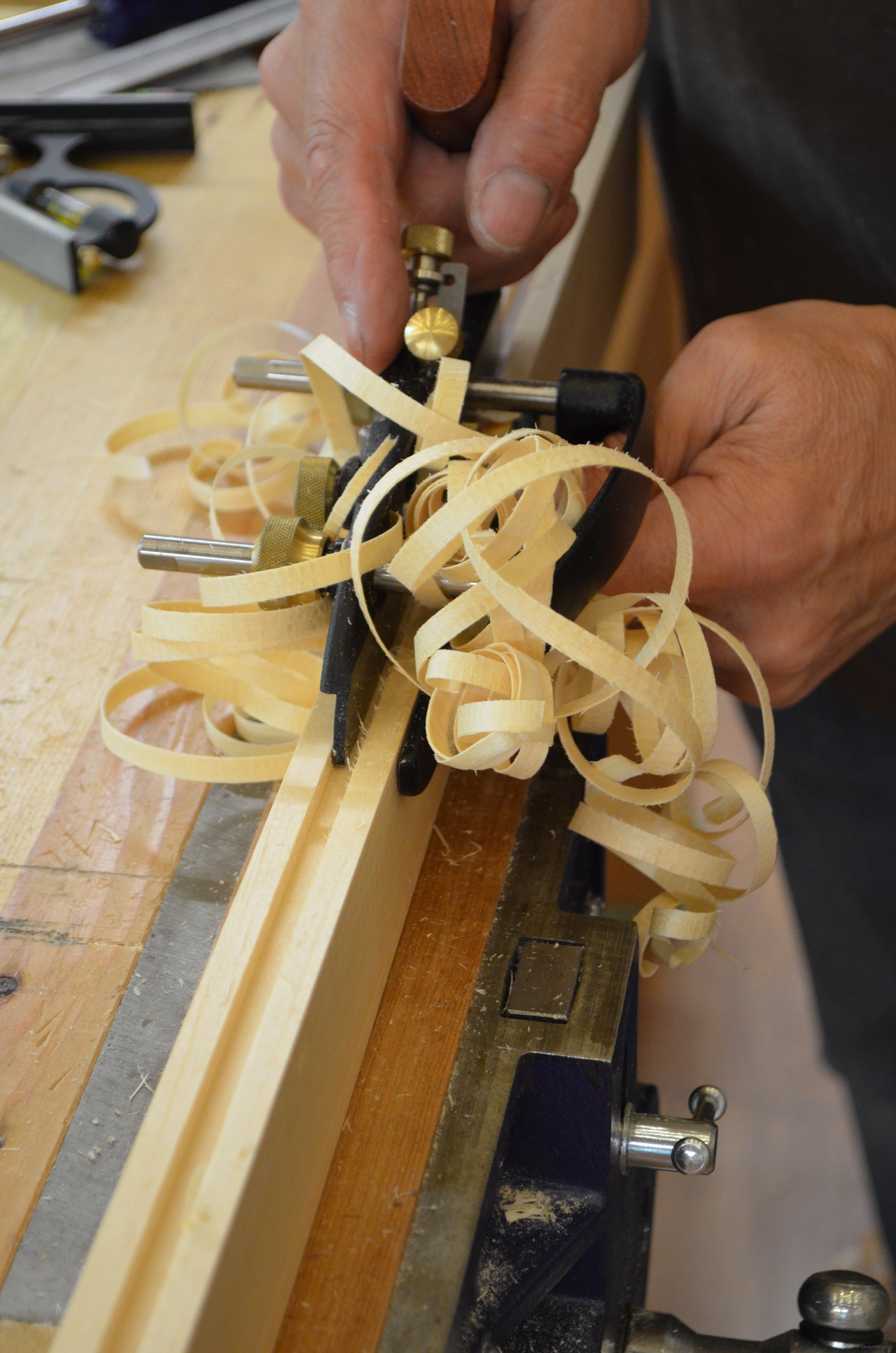 Now set the plough plane to task and run the groove. The wall will be clear and neat and should look as good as any machined edge you have ever seen. Grooves two feet long and 1/4" wide by 5/16" takes less than two minutes to run.