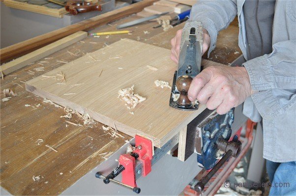 A four-foot clamp will arrest a full table top on the bench and will also hold something 2” square or less. I place the work in progress on the benchtop and then secure the edge overhanging the bench edge and vise in the clamp. A 2’ x 3’ coffee table top can be readily scraped and planed and sounded without movement or vibration. Notice that I can change direction to plane away from me across the bench or along the bench. Long tabletops can span the benchtop and be worked from either end or turned around for comfort as needed.