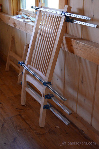 My chair was glued up last night as I left the workshop, so I felt contented as I tightened the last clamp and made certain for the last time that the joints were all unhindered and uncompromised in their seating. everyone is at a different level now bit mostly they have the two main front and back frames fully fitted so now its just a question of planing the surfaces with the #4 plane and then roughening the surface with #240-grit sandpaper ready for finish to be applied. many of the students find their hands and the oak turning black from the tannic acid reaction so for them I suggest they leave final planing until after the joints are made. Of course the only reason they need to sand in the first place is because of the marks in the surfaces left from the planers and tabesaws.