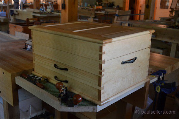 This is one of the completed tool boxes. I am about to milk paint mine so will post pictures later with the result. Remember that the tool box at left is only the second dovetailed project this man has made and that the drawers have perfect half-laps too.