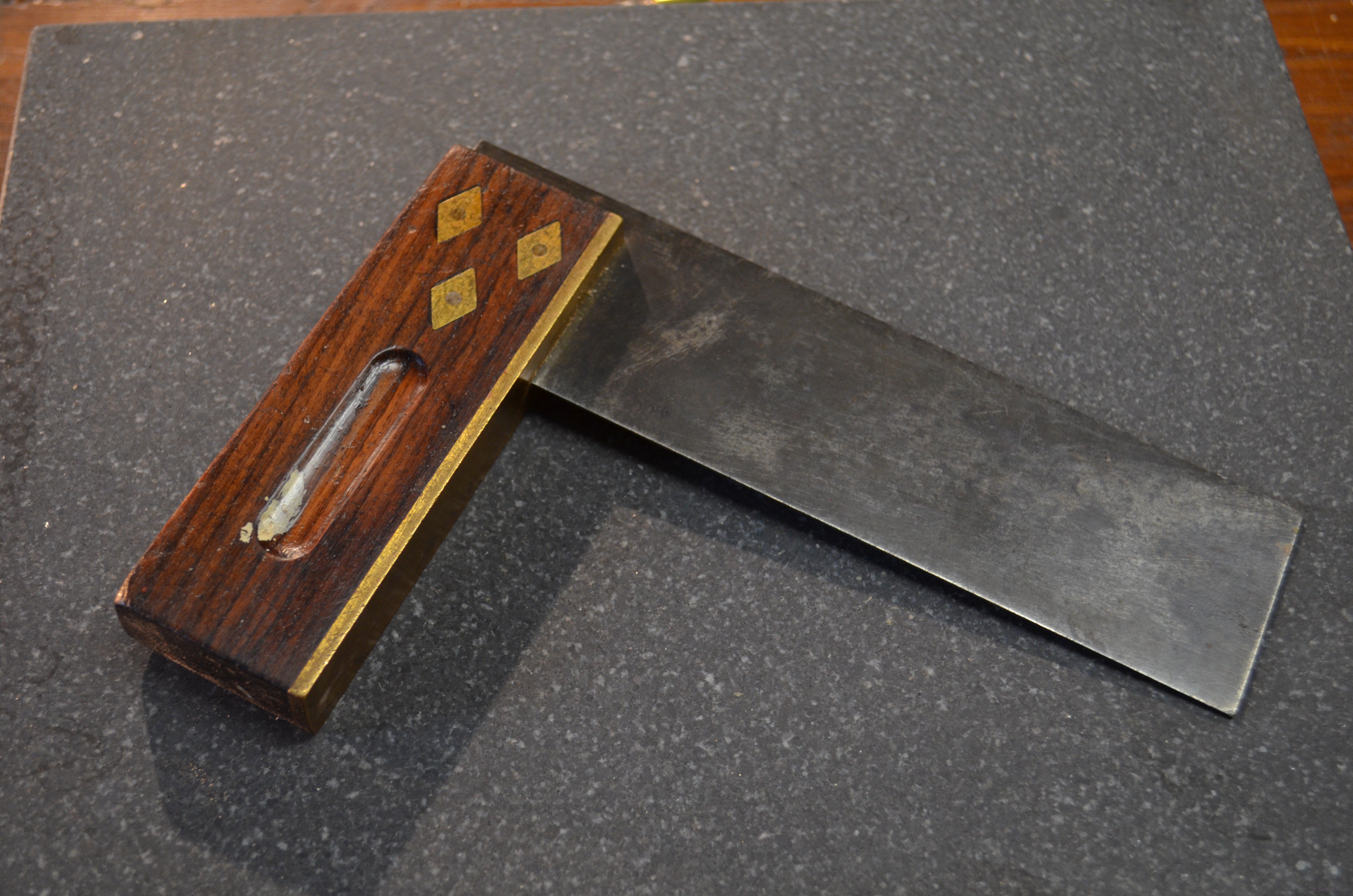 I buy the traditional squares, the ones with wood and metal (brass) stocks and wide, flat plates too, if I see them and also good ones like this Rabone square made in the 1940-50s, because they are useful too.