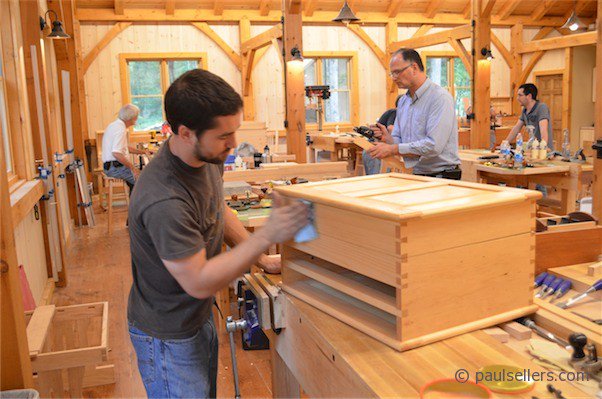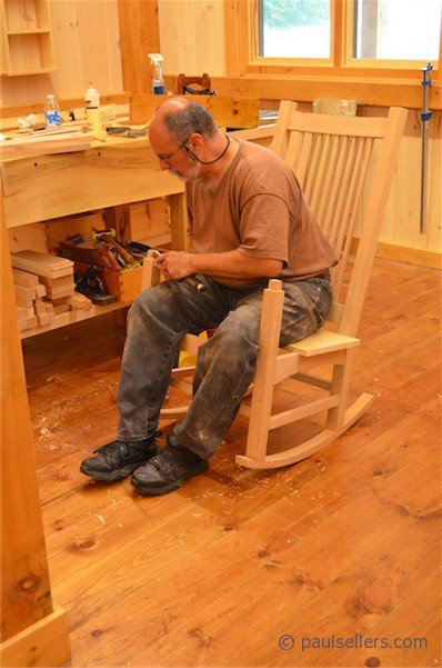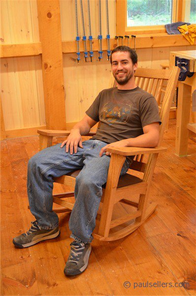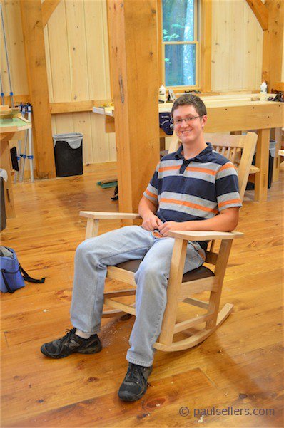 Some pictures posted of people working with hand tools are images I took that record their transition from never having worked with wood. By my passing on what I know they have gained decades of working knowledge in a matter of weeks. Logan is 18 years old, just. He just made a rocking chair in oak and upholstered the seat in leather in seven days. I never sawed a stroke of it or planed a surface on it or chopped a single mortise cut. The joints are all tight with gapless shoulders. He has a rocking chair. What can now stop him from making any chair he wants to? Best of it is, he didn't come to make a rocking chair, he came to master the skills to make a rocking chair and now he has them. He owns these skills. That's what people seldom understand and that's what you don't get when you use machines. Alongside hos chair he made a coffee table. The skills that took translate into tables of any kind he cares to make. He has those skills as his own. he no longer needs Paul Sellers and that's the same for all of those who have just spent a month with me.