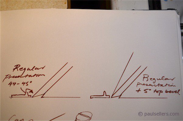 This is of a course nothing more than a very super-narrow micro bevel, which takes only two short rubs on the sharpening plate or stone at the finest grit (1200 is enough) to establish. This effectively presents the iron's cutting edge at the same angle as the high angle frog at a fraction of the cost and yet enables the same proactive engagement at the cutting edge. This is also effectively what people are doing when they use a ruler on the surface of the stone to lift the iron to achieve a reverse bevel on the iron to take care of surface pitting at the edge of the iron or indeed a hollow iron. Most people I knew as a boy would always free-hand this, which works very effectively and gets on with the job.