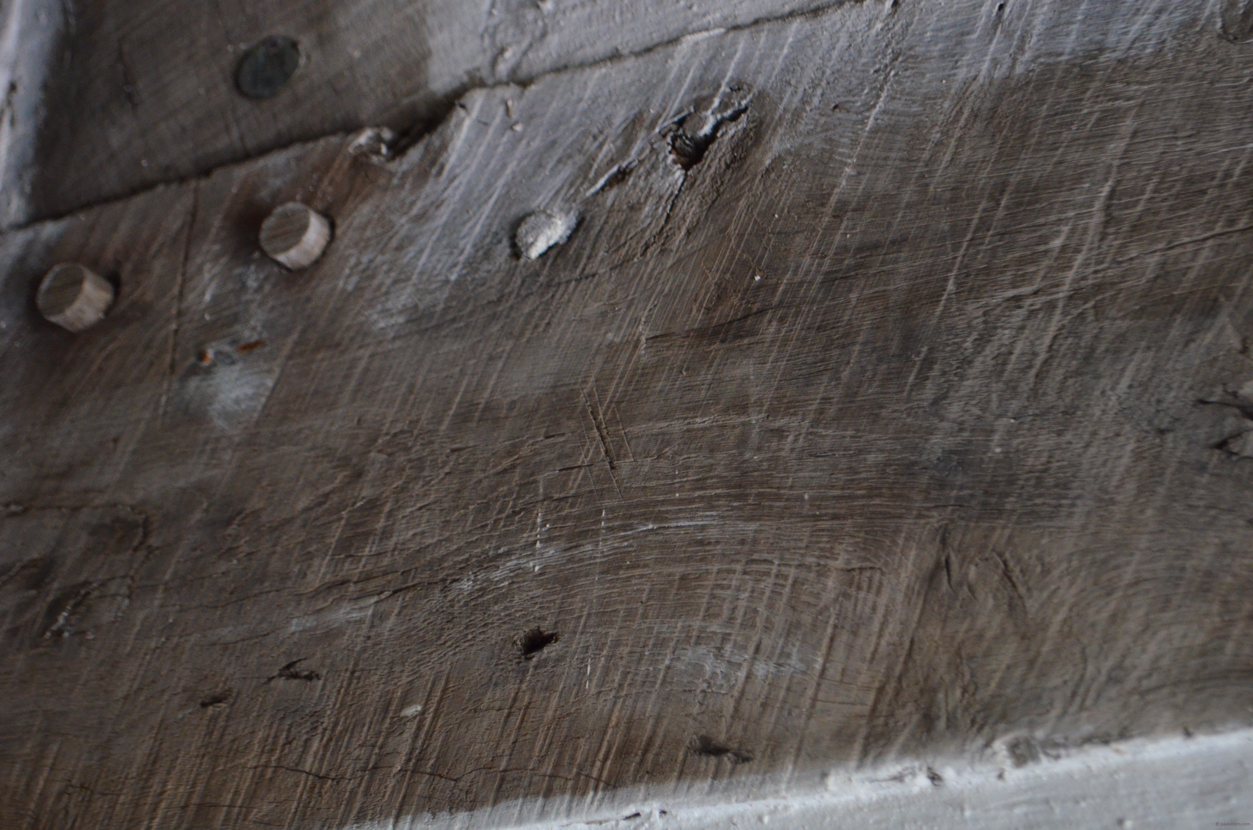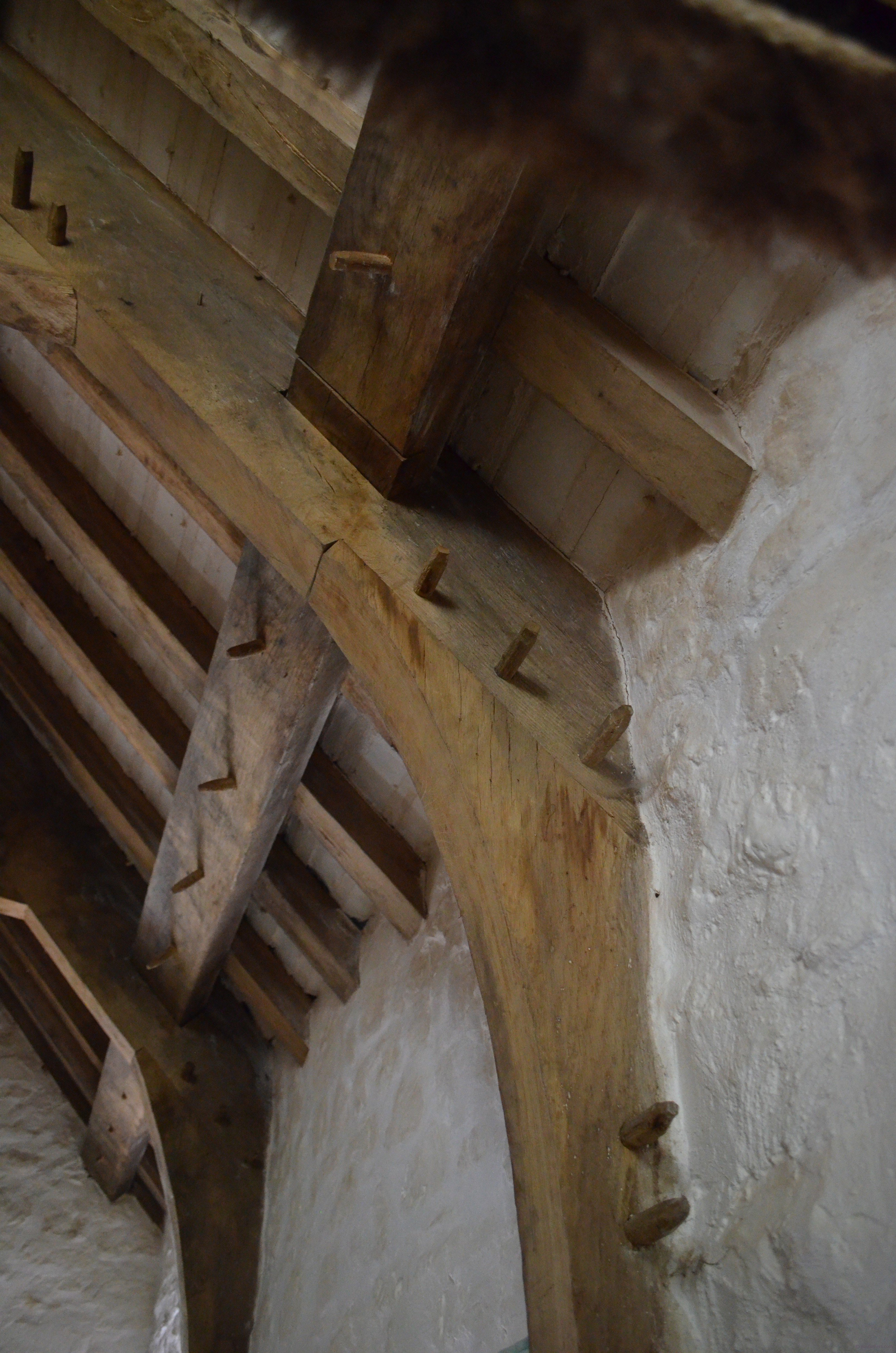 The roofs of buildings are seldom seen now hidden behind smooth sheetrock and pasterboard textured with patterns and lifelessly smooth. I look up as much as I look down to see the crown of a king-post truss and the trunnels passing through beams of thick oak and chestnut. Cleverly devised from the non uniform of barely cut wood I see a jewel of workmanship above my head and wonder.