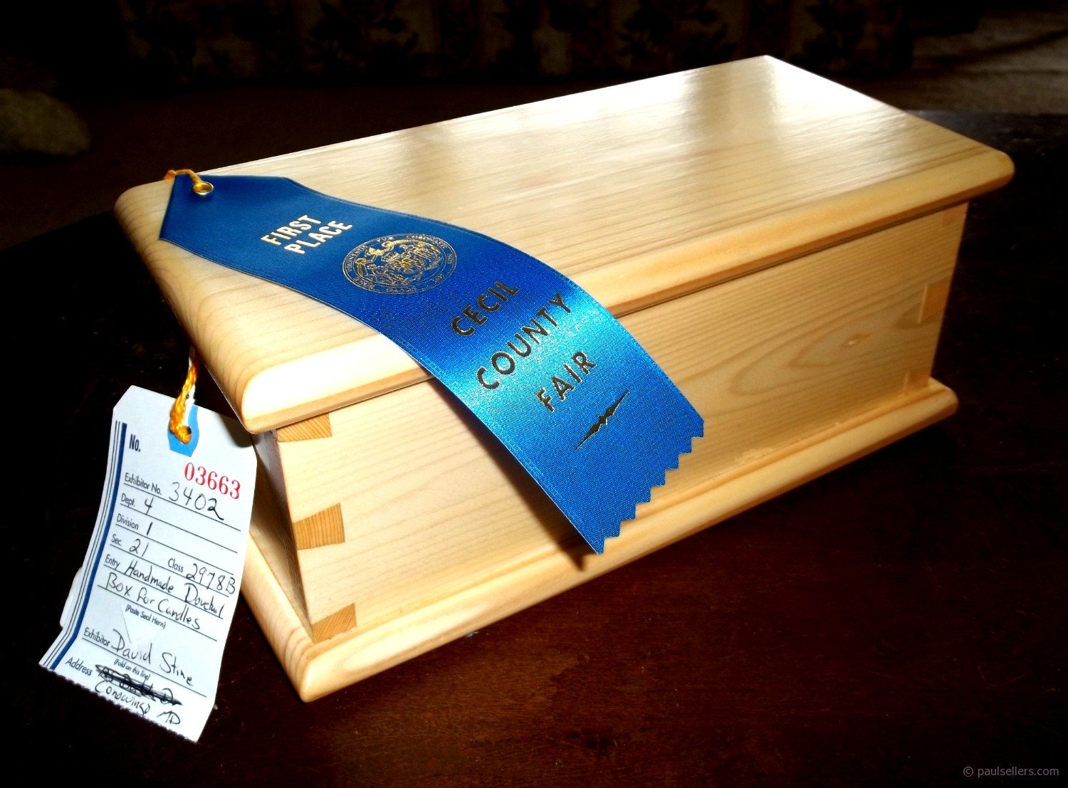 I entered one of the boxes I built at home into our County Fair this past month. I was honored and shocked to have won First Place in the Woodworking Box/Case division. The judges had also taken the time to write "Beautiful" on my entry tag.