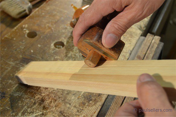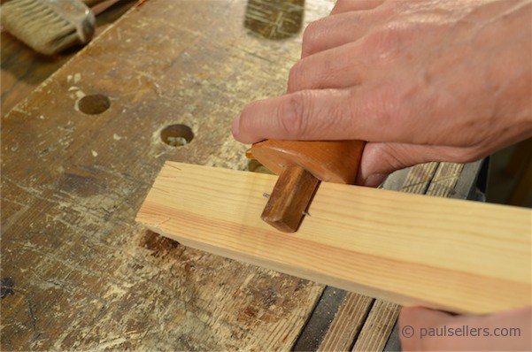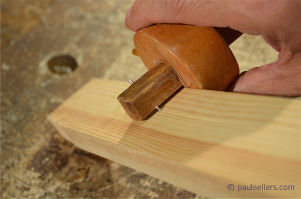 I think that it helps to see hand positions on tools and my best thoughts are to show from photographs how best to arrange and then practice using them. With the gauge issue, I have come across hundreds of people who struggle to use great force when the opposite is what is exact to task. When I show them how simple and lightly they should generally be used they are amazed at the pleasure they suddenly develop. The picture at left shows the change in visibility I have by extracting the original pin and positioning it catty-corner on the beam as shown. I use this converted gauge more now as my regular gauge. Rolling the gauge forward and pushing it away from me so that the pin trails and is totally visible throughout shows the kind of pure clarity I gain in relation to my working.