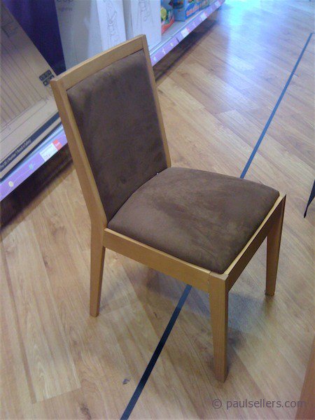 this weekend and saw this sign. The sign is both explicit and subliminal in that it states the table to be “Oak” when it has never seen or smelled or touched oak in its life except for the pallet it was shipped to the UK on, and that the chairs associated with it are made of pine and colour-matched to oak. Oak, what is described as a Chiltern Oak Table, is in fact what we call particle board (in the US) and chipboard (in the UK). This material is not continuous-grain real wood but pulverized chips held together with synthetic resins and bulking agents. It is a false-economy board that seems inexpensive to buy but lasts for a fraction of the time real wood does. If I were to use this material and sell my furniture as Oak I would be prosecuted by process of law for false representation otherwise know as lying. Argos does this blatantly and no one knows because no one knows. The staff don’t know, and people don’t know, but, underneath, lying on their backs with their iPhone as I am to get these pics, they know. Melamine surfaces that look like oak like this are deceiving everyone. It proudly states a half price reduction on something that probably cost Argos less then £50. If you buy this table it will most likely last less than 5 years max. The legs are 3/4” thick corner jointed so they look visually at first glance to be 4” x 4”. If you drag this table across a carpet the legs will fall off I assure you.