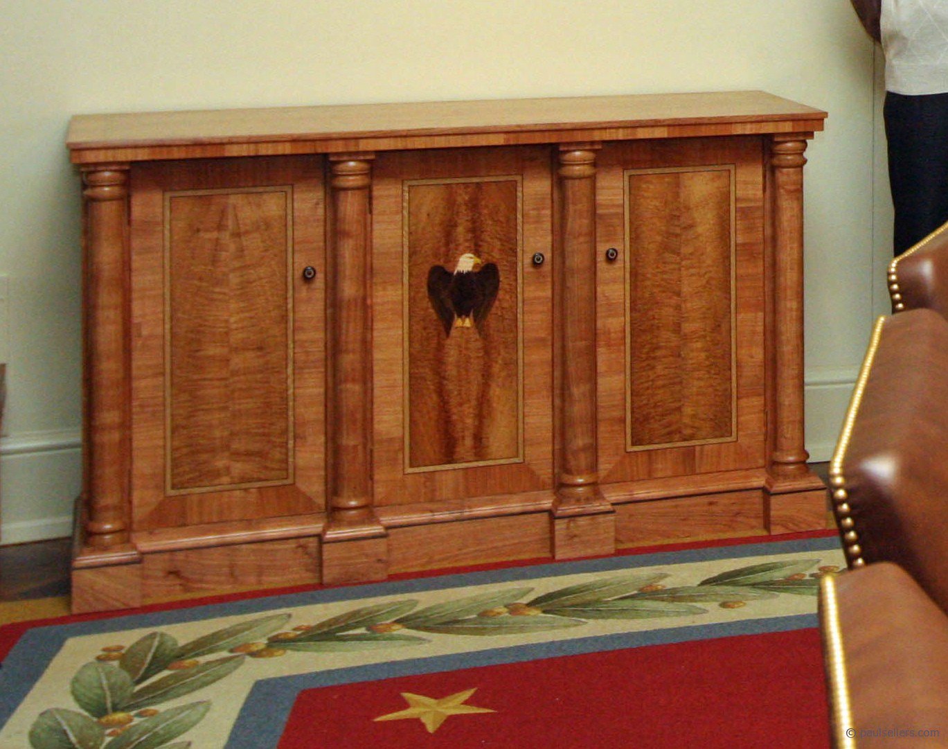 I designed this piece for the White House Permanent Collection in 2008 and together with my sons and friends I had trained through the years we made two of them as a matched pair in 2009. 36' tall and 6' 6" long they now stand on either side of the Oval Office entrance way in the Cabinet Room. You never really know where you can end up following your heart to become a woodworker.