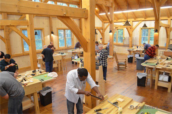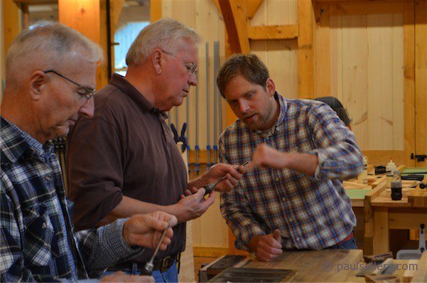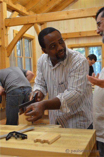Watching, waiting for accuracy to emerge in each student varies. Some get it immediately, while others fall behind a little. One man moves rapidly, makes a mistake and recuts a whole piece, others just get it. Three-dimensional woodworking generates energy between the benches. The new successes translate into smiles, relaxation and often laughter.