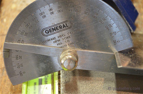 The bevel on the cutting iron was ground at 25-degrees as if being a regular plane iron rather than a scraper iron. This leads me to think that Faithful knows nothing about the tool. To establish the correct 45-degrees is easiest using a honing guide like the one shown here. I set the proper angle using a combination square.