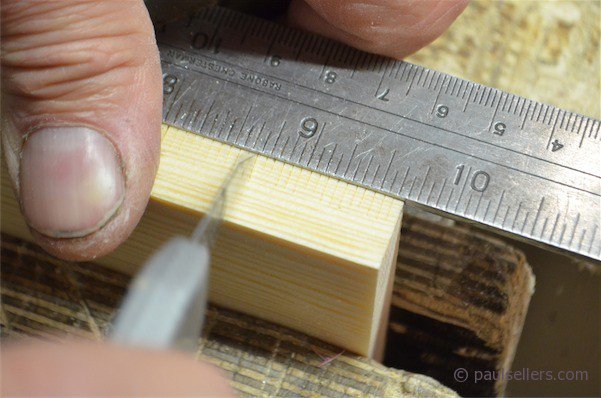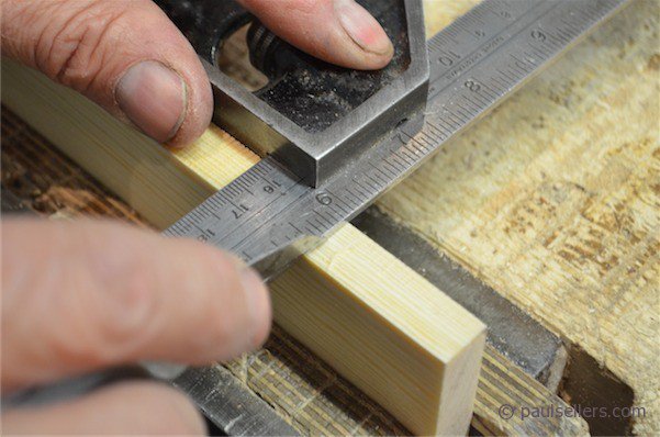 By cutting accurate channels, in a matter of minutes I had my saw file guide for recutting and I was able to recut the Disston. Because the best size teeth for almost all tenon saws and dovetail saws is 16 TPI (teeth per inch), I used a rule with 1/16” divisions to map my stick-of-wood saw-file guide. Begin by holding the rule or, in my case, the combination square beam, against the 1/2” by 1” piece of wood. An 8” long piece is sufficient. I marked only about 3”. The stick can be then be moved along and carefully aligned with the last tooth cut as you progress to the end of the recutting process. With the points marked onto the wood with a sharp, pointed knife, I square the lines across the full 1/2” width. Then I take a sharp 3/4” chisel and make an incised cut from one line to the adjacent line. This creates a definitive wall that then aligns and guides the point end of the file perfectly. Starting with the point end in the far side of the guide, i file the tooth front.