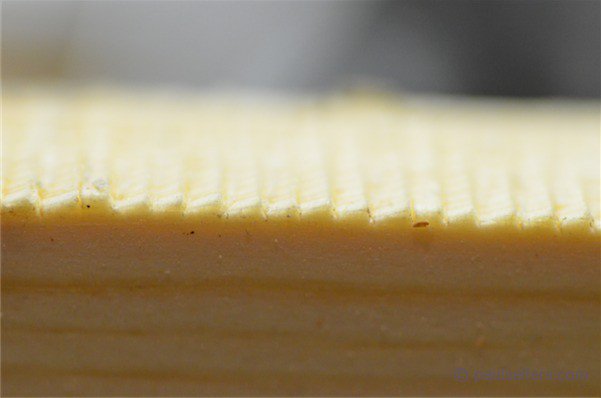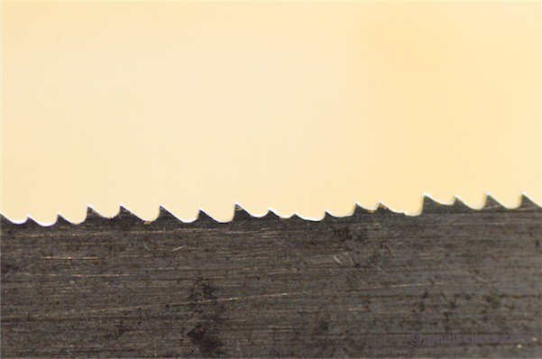 cut to the cutting face of the saw tooth and it’s this that makes the saw more aggressive for faster, deeper cuts. Take care to cut to the exact line and press harder in one direction, left or right, to align the file to the knife line. Once you have say 1” of alignment cuts that position the teeth, go back and file the teeth to depth. Work methodically from left to right. Go down to depth. This is gauged by filing until the light on the top of the adjacent tooth to your left becomes super thin. The final, partial stroke removes the light and the cutting edge of the newly cut tooth is level with the edge of the saw. When the saw teeth are cut to the extreme of your guide, move the saw guide along and align the cuts in the wooden guide with the last tooth you just final cut and start the next section. The whole process of recutting the actual teeth should taken no more than 20 minutes. This system also works well for simply changing tooth size.