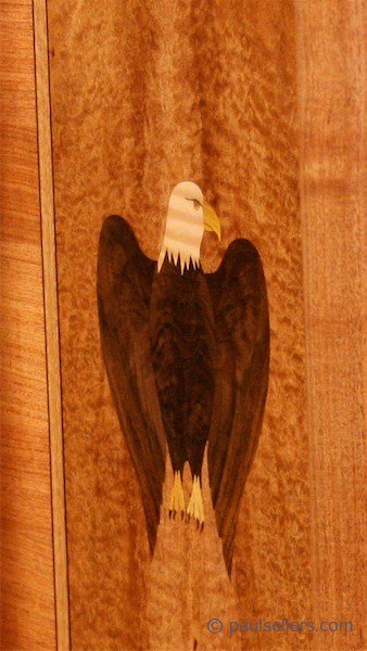 When we made the two credenzas for the Cabinet Room of the White House Permanent Collection for President Obama’s Inauguration four years ago we used crotch grain Black Walnut for the body feathers because it had the same perfect configuration for what we needed as you see here in this clock. Actually, most of this inlay work was Joseph Sellers' work. The wings on the bald eagle motif was made from crotch-grain black walnut also. We made two exact book-matched fronts to the entirety of these cabinets, so there are actually two exact opposites for the eagles as they face towards each other from the adjacent pieces either side of the Oval Office entryway from the Cabinet Room.