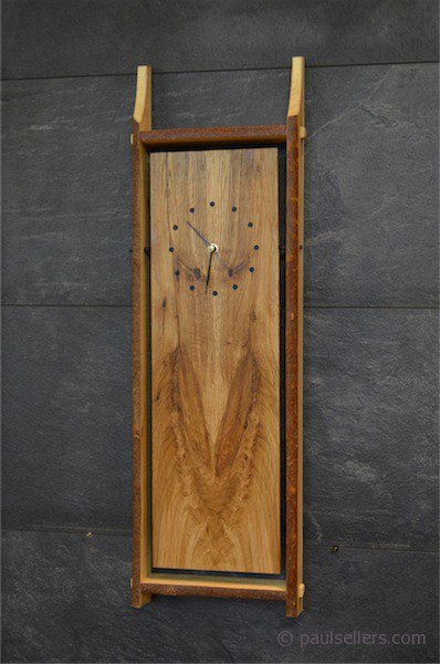 This is one of the clock designs I was making for the new book. The one I made from some book-matched rough stuff. I had some ebony and made the round hour buttons and the pivoting points. I called it Time Suspended.
