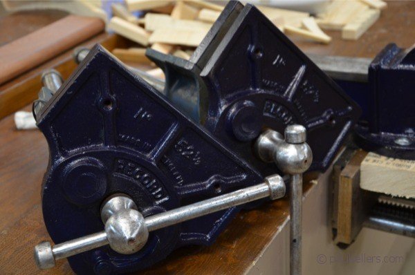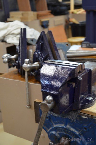 I found a wonderful enamel gloss paint in tiny pots to paint my vises with. One pot does two coats to six vises and that translates into low cost paint job at £3 per pot. The company is called Plasticote and can be had from B&Q. It is amazingly a water-based paint that dries quickly and can be recoated in half an hour or so. Another feature is there are no health warnings on the jar. Not one. It simply states the low levels of VOCs. Here are the finished record vises I worked on last week.