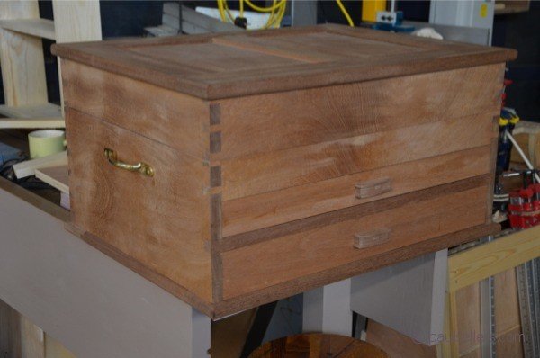 On the current woodworkingmasterclasses.com series I just concluded building the woodworking tool chest and here is how it looks today. We will be adding veneering, inlay work and cockbeading sometime in the in the near future, but as it stands, this is the first film series that teaches, door making, box making and drawer making using traditional hand tool methods for training woodworkers around the world through online broadcast. How about that; I mean we have haunched mortise and tenons, rails and stiles and raised panels in hand ploughed grooves and we never turned a machine on to perform any of the tasks mentioned. Then we have half-lap dovetails using a very unique method developed for the task that adds a slight quirk that eliminates the need for marking gauges yet brings superb accuracy to this difficult joint. We added another twist to the housing dadoes at the rear of the drawer in that this housing dado also has a through, cross-wedged tenon to each corner. Again, we ploughed the grooves by hand and the steps give perfect results without screaming routers and tablesaws. The box itself is as always fully dovetailed and split by hand saw. A technique that guarantees the two halves are perfectly sized and aligned. I could go on but this is what our online training is now bringing to hundreds of woodworkers around the world. We added hand made handles tenoned through the drawer front to cap off the whole chest. All that's left to do is a free video on how I finish the chest. Please remember that there are paid and free membership levels. All of our technique videos are indeed free, so if it's saw sharpening or a method of ork we see essential to skill-building we want everyone to have it.