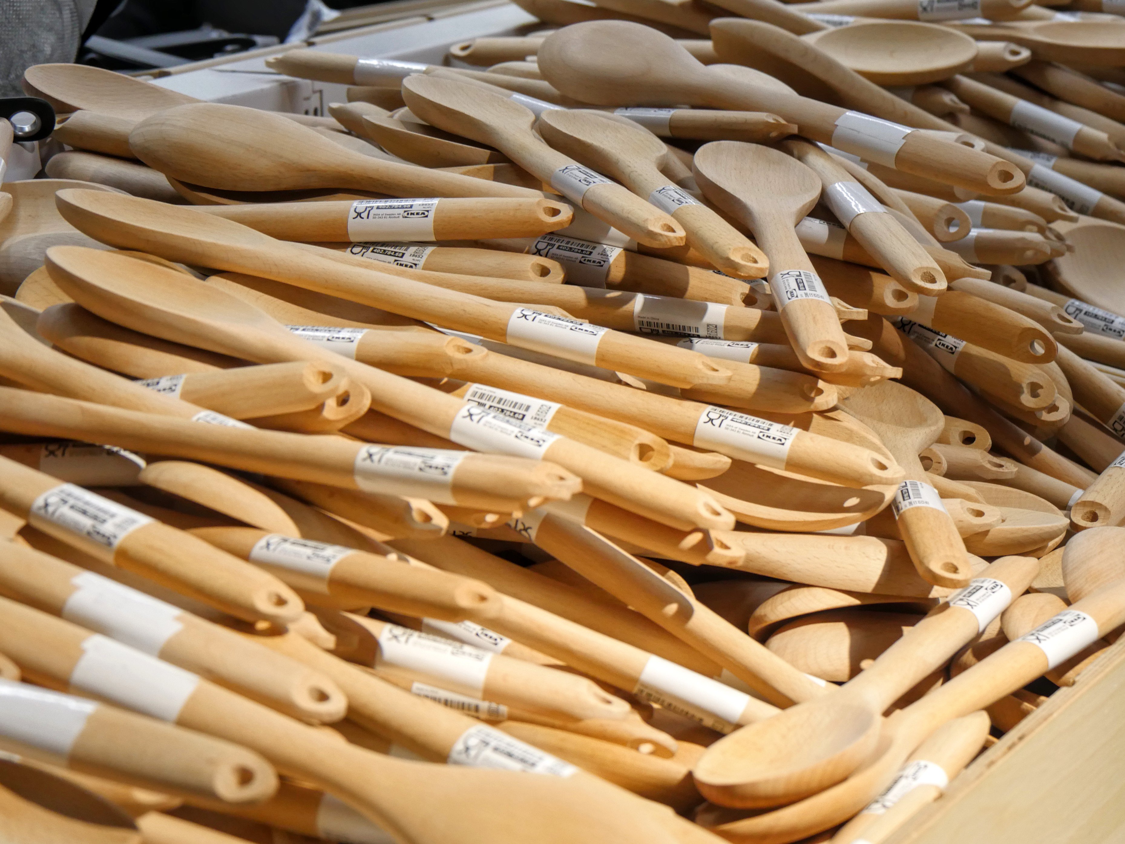 When form and function unite, a perfect harmony of design rests in completeness. The cost of producing such beauty becomes legitimised and there is no more to be said of their validity. I have owned these salad servers for about 40 years now. I bought them from an antique shop in GB because of their beauty in craftsmanship. I also wanted to save them for fear such workmanship by a man might be lost to us. Whereas companies mass-make often unbeatable wooden spoons from solid beech that are well shaped, fully suitable and then at an affordable price, a handmade work of art would never be ascribed to the product they make. They end up piled in bins like these or are treated most commonly on supermarket shelves with signs saying buy one get one free. Such soulless merchandising is the way of the day we live in and that's why a spoon carver on a street in Oxford or along a woodland path is such a prize to us. No doubt, because such products are cheapened by the modern methods to mass-make, we more readily accept anything that moves towards our undervaluing of the wood as a whole. Such spoons may well end up in the landfill. I doubt whether anyone with any soul would throw these salad servers away, but they might. Such possibilities worry me because such things as these are no longer being made. People wonder why I dislike certain stores but it is not the stores so much as what they represent and how they have become established the modern-day answer to need. Luddite? I don't think so. That was the word I learned in school, from a 25-year old teacher who never made much of anything, to derogate people who liked the idea that not all things made by hand with care were opponents to progress.
