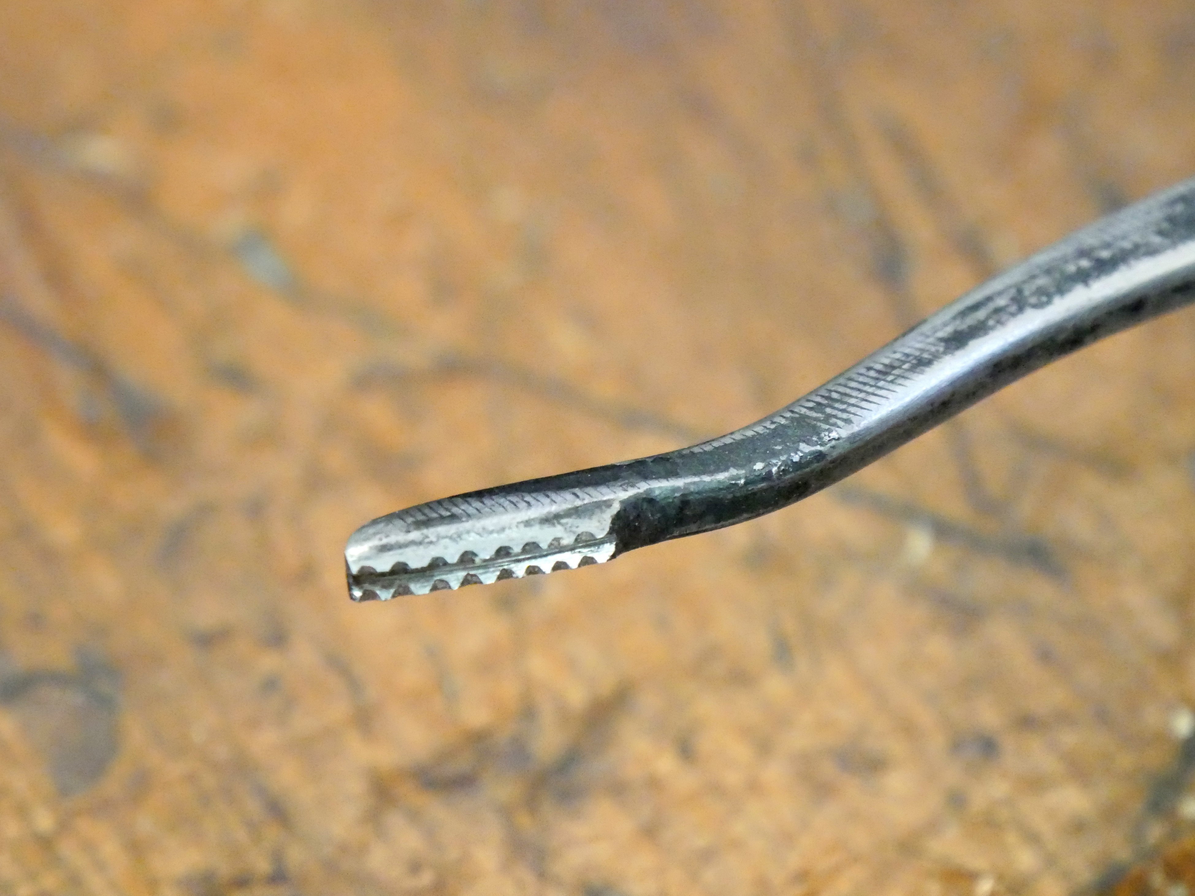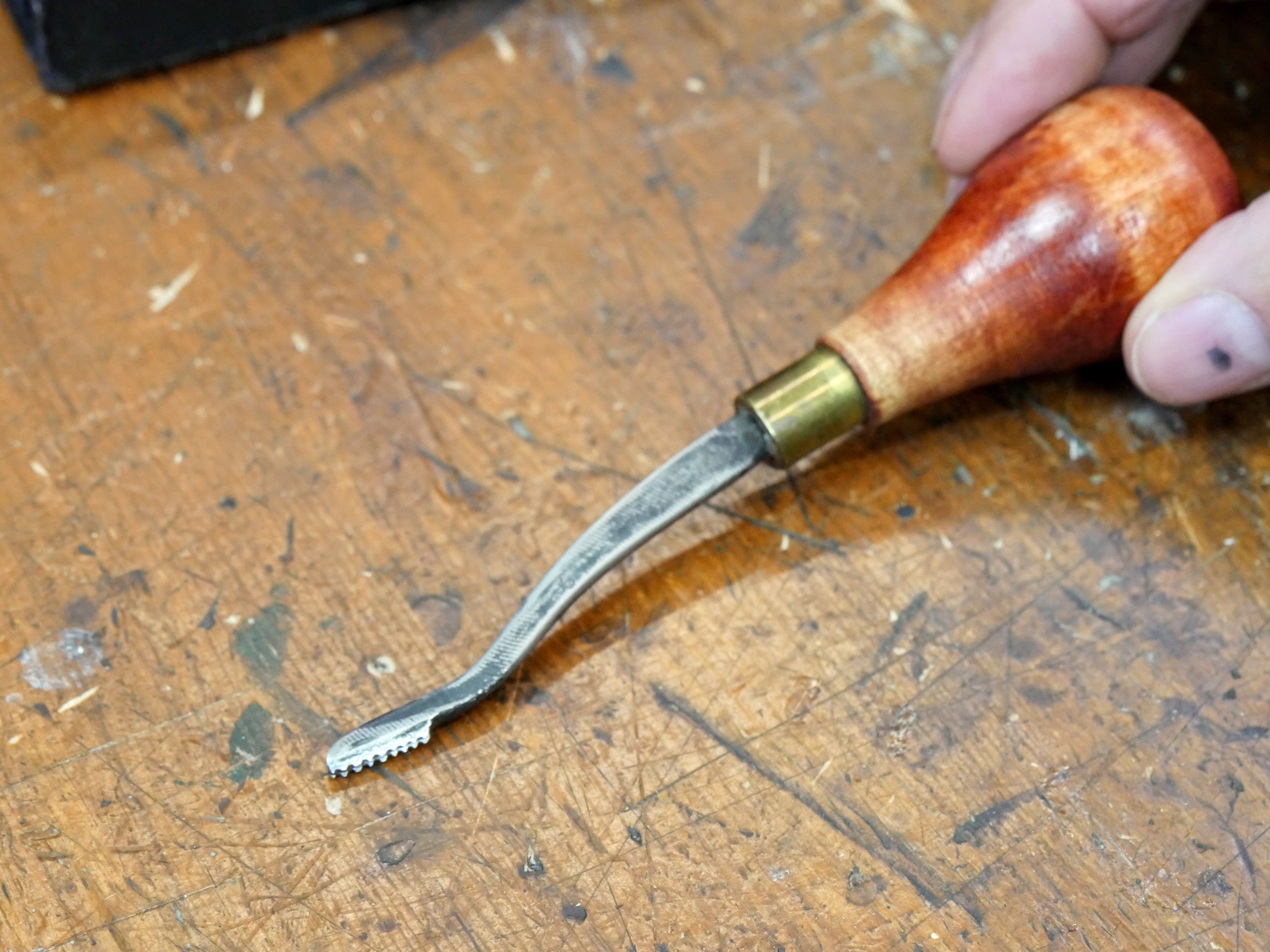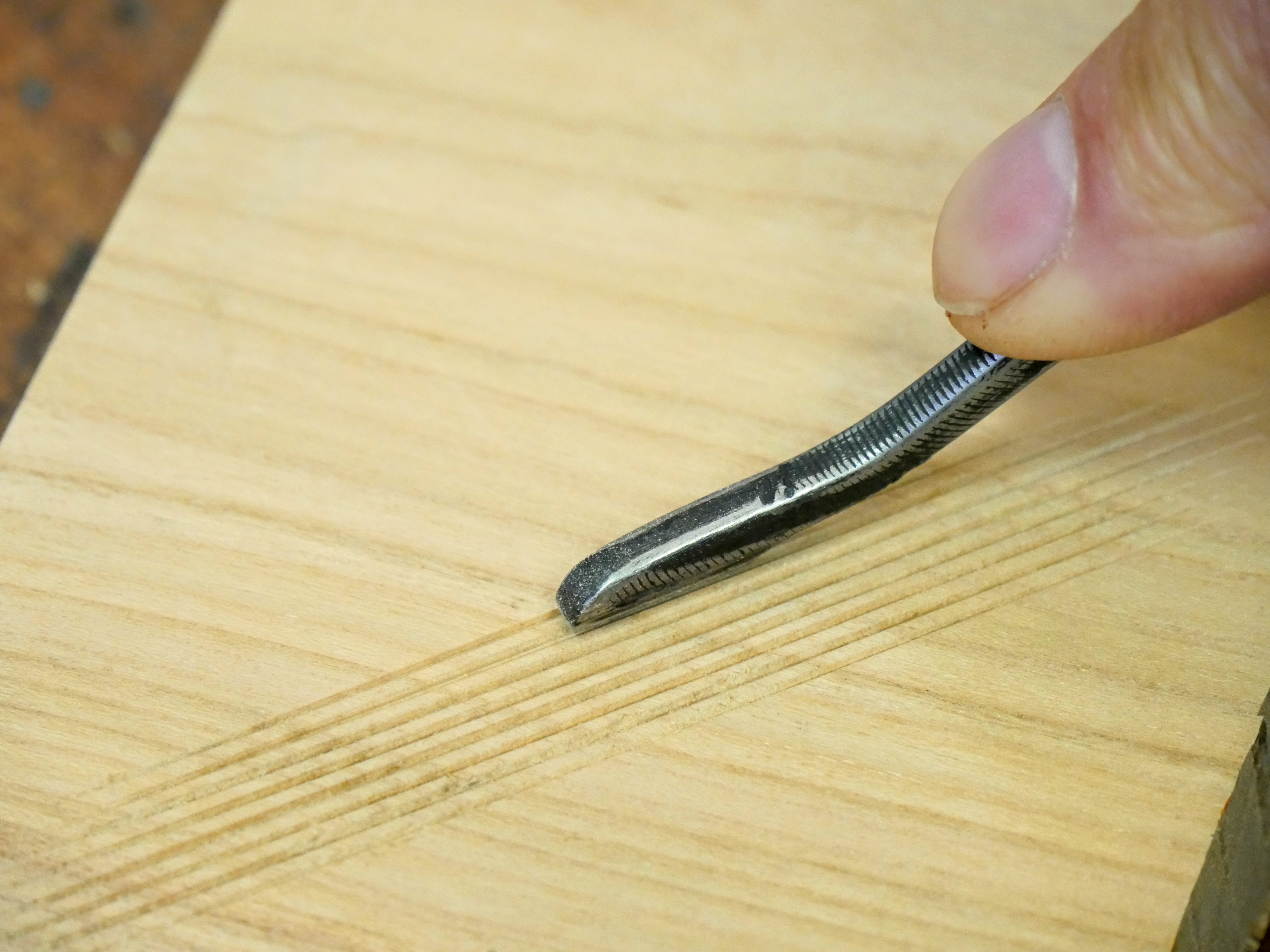 By creating an initial parallel line with a straight edge, subsequent lines are created by placing one set of teeth in one of the two vee-grooves created and following the line a third row is created. Several such passes are made and before long a whole surface looks like a ploughed area. Arranging a second range of such patterns at an angle, diamond pinnacles are created as the second level works the surface. It takes practice, but the result is really neat; not just neat, stunning. You can decorate boxes and furniture using this system.