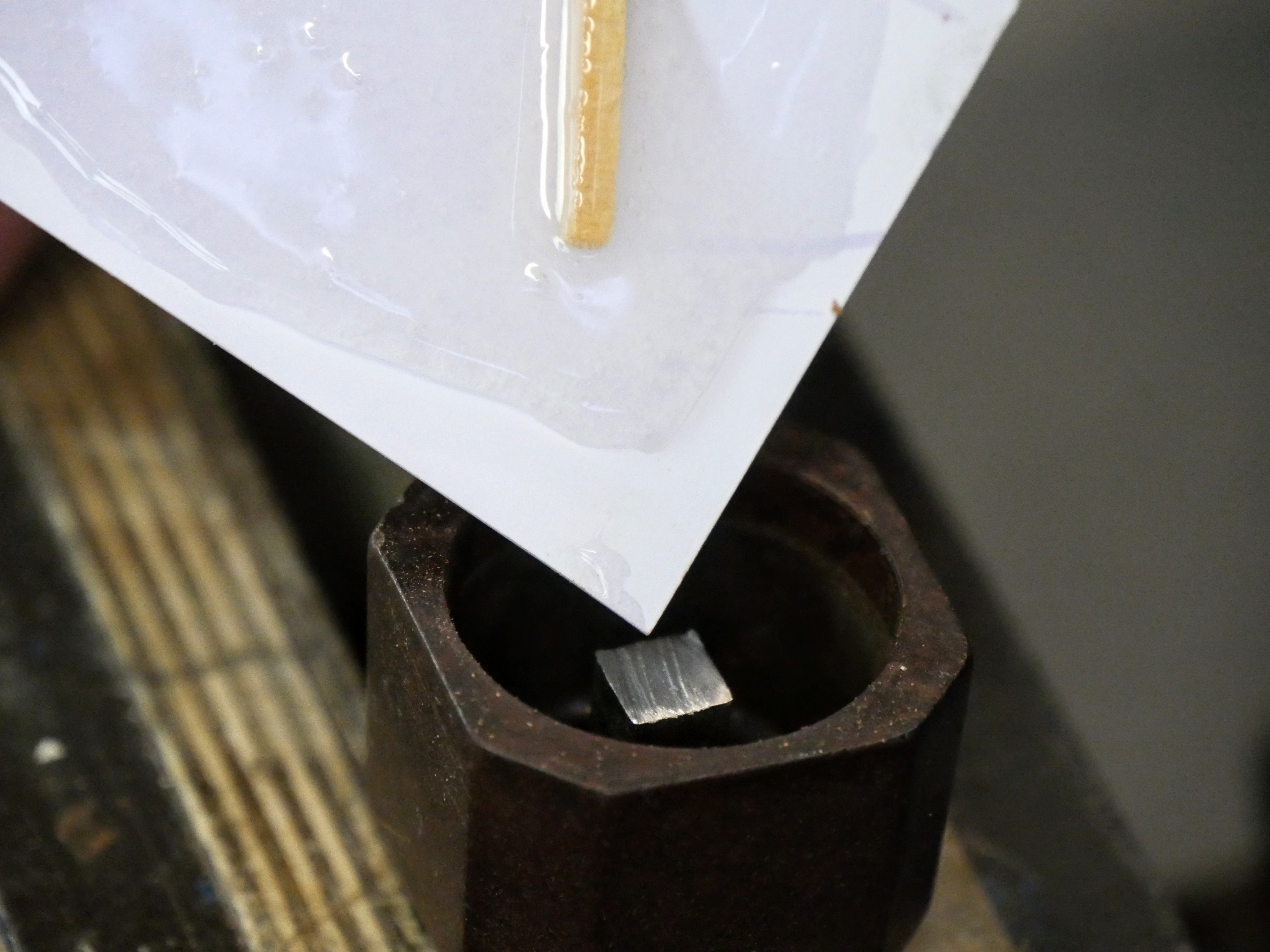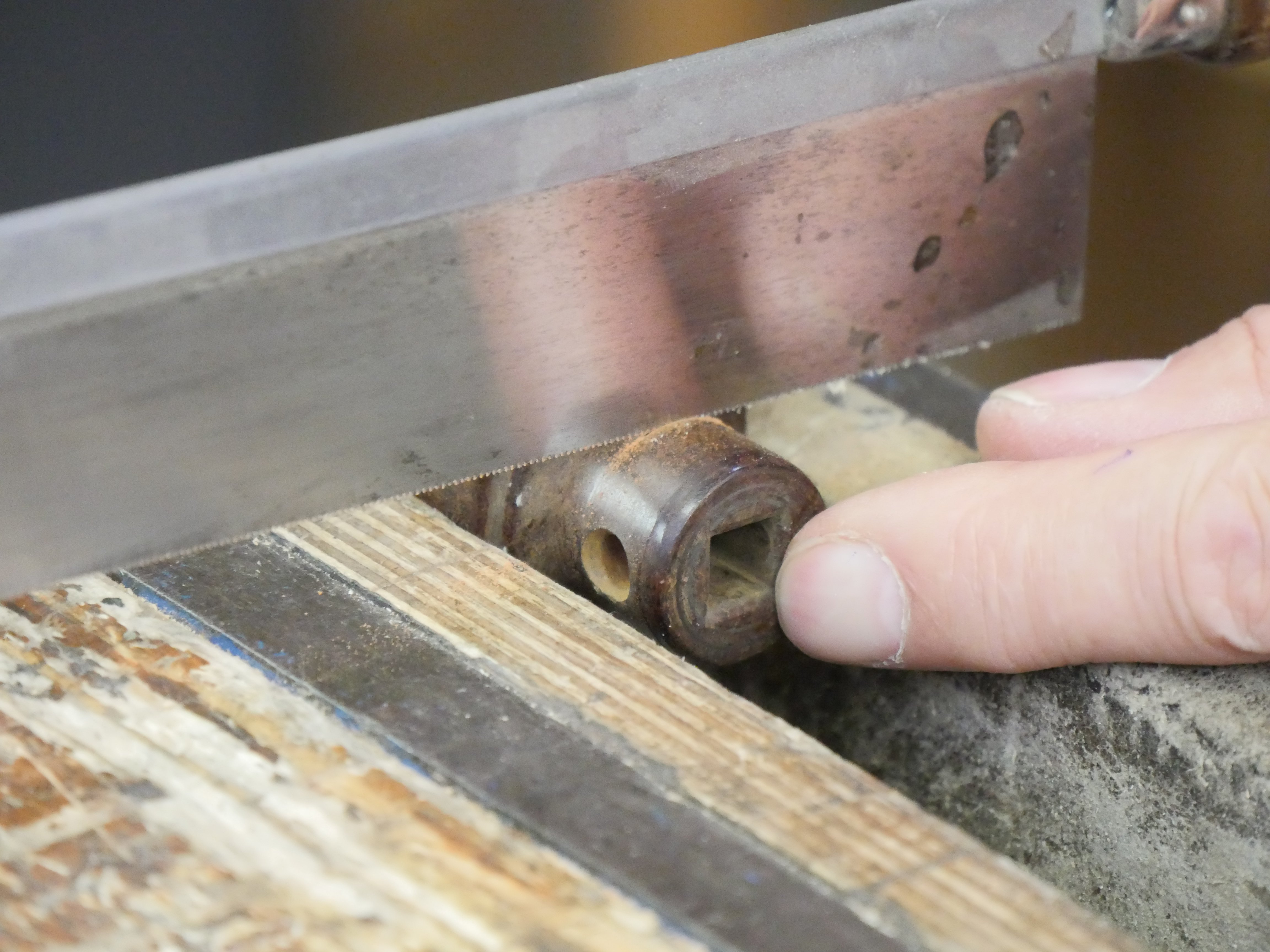 Firstly, I knew I had some ferrules so I could size the diameter I needed as a capture ring around the main stem I would use for the screw-driving part. I know some plastics to be brittle and would not on its own hold up to the torque needed for cinching the setscrews tight on plane irons. Keeping the square shaft inside meant the plastic would not be relied on at all as I could cut a slither from the metal shaft to receive the plate steel that would drive the setscrew. This plastic knob was extremely brittle but I could see attractive possibilities too.