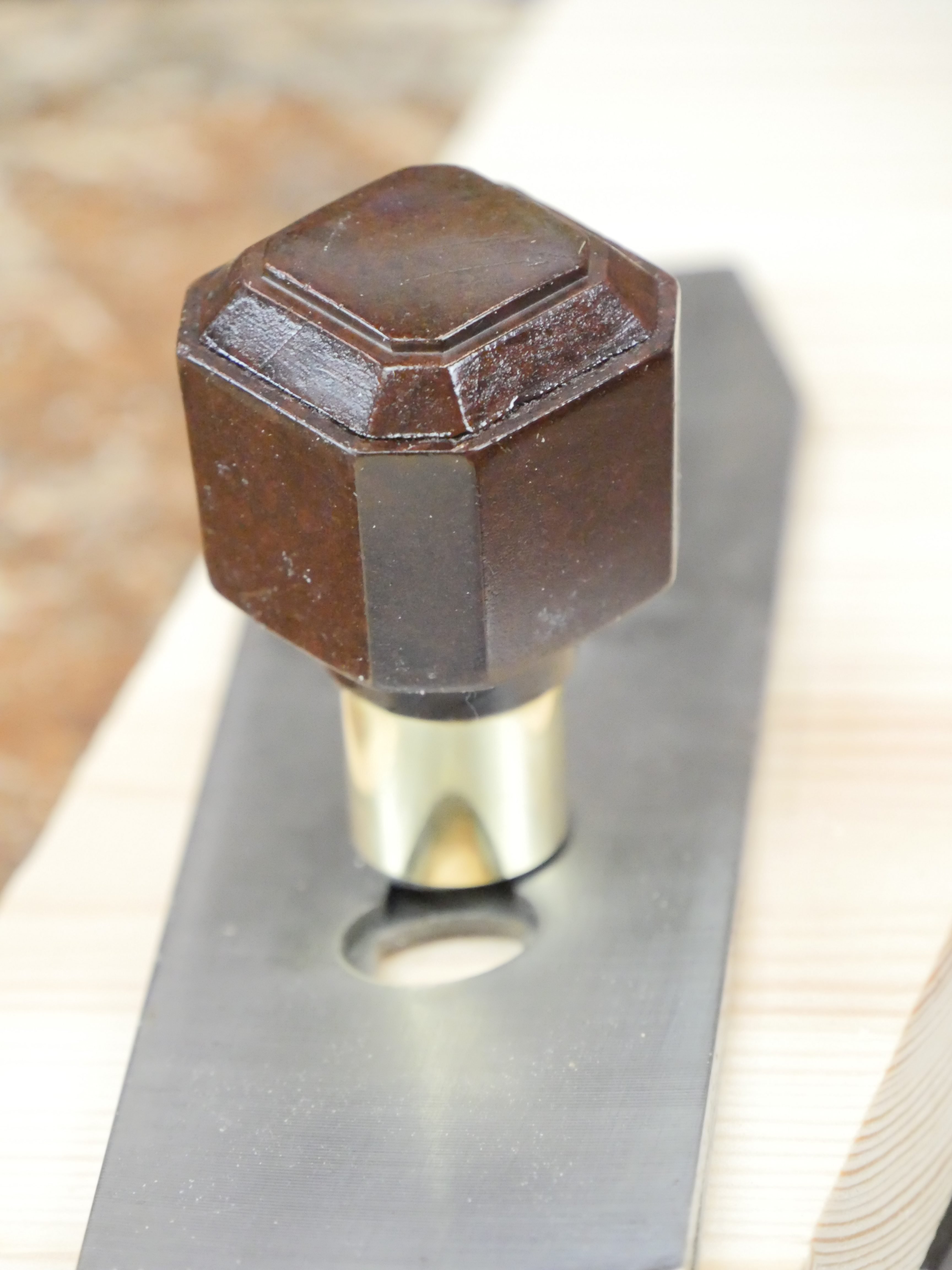When I pass through towns on business or when shopping for normal household and workshop needs I stop in charity shops because for upcycling, recycling and just plain good finds at a low cost you can’t beat them. In a nearby town I happened into one and wandered the mass of mixed goods. I found a nice Victorian chest of drawers in mahogany I had been looking for and then my eyes passed over an old plastic door knob that was little unusual. I bought it for 50p. The chest of drawers cost me a lot more. I'd been looking for door knobs since I mentioned the twin use you could put a plane-iron screwdriver to a few days ago (See here for more). In a matter of half an hour you can take a knob like this and upcycle it, which is what I did. Here’s how.