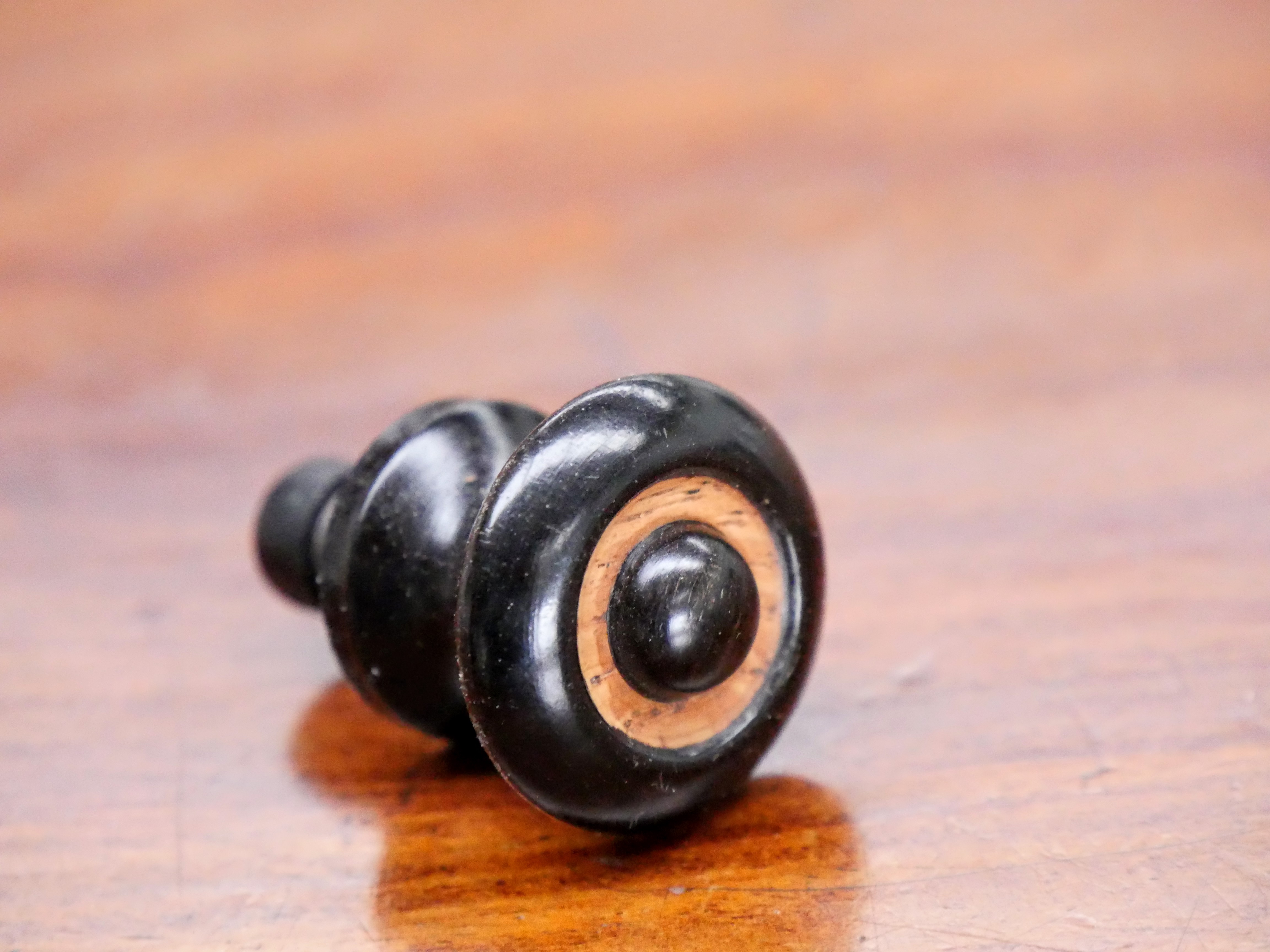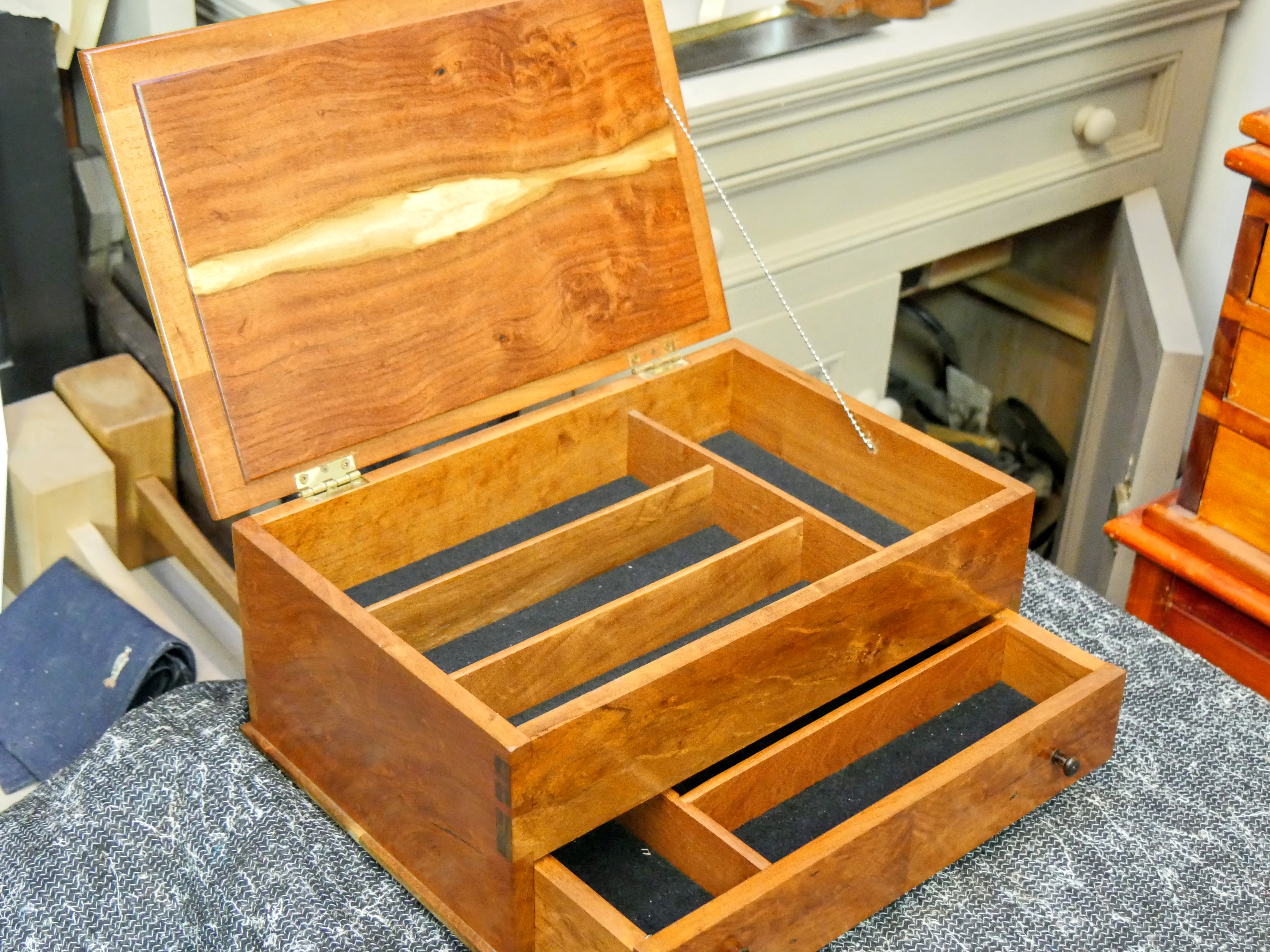 The box was a gift for my wife in this case but I made several to this design either as jewellery boxes or for silverware as in this case for Liz. When we made the White House pieces in 2008/9 I used the same crossbanding but added inlay in ebony for accenting and oak from what they at the White House called the Harrrison oak, because President Harrison planted the original oak tree during his term of office. Then, amidst my treasure finding, I found a spare knob I designed especially for the cabinets. The oak ring is the Harrison oak also. Perhaps one day I will find time to make a video on how the knob was created with the Harrison oak ring and the 'eye' in ebony.
