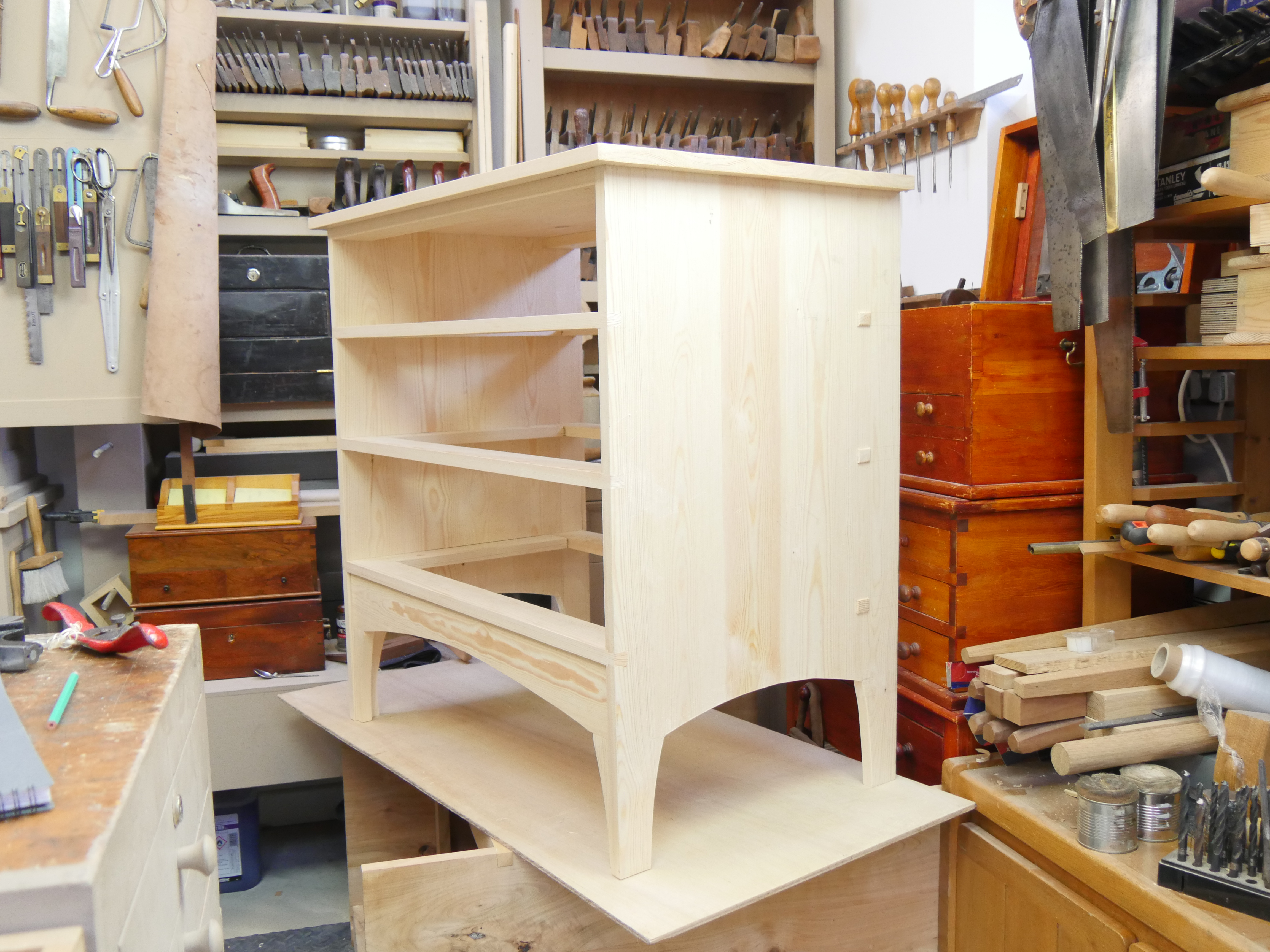 Over the weekend, having glued up my prototype Friday to show Eloise the complexities we face for filming it, I cleaned up the joinery with my #4 Record and the overall structure had remained dead square after I took off the clamps, which is always a good test. Today I will prepare for the next phase of filming and then finish of the prototype cabinet ready for making the three drawers. I can hand plane most of the external surfaces to erase any marks but in my case this prototype will most likely be painted. I have all my drawer stock already milled to near size and the rest is of course all hand work.