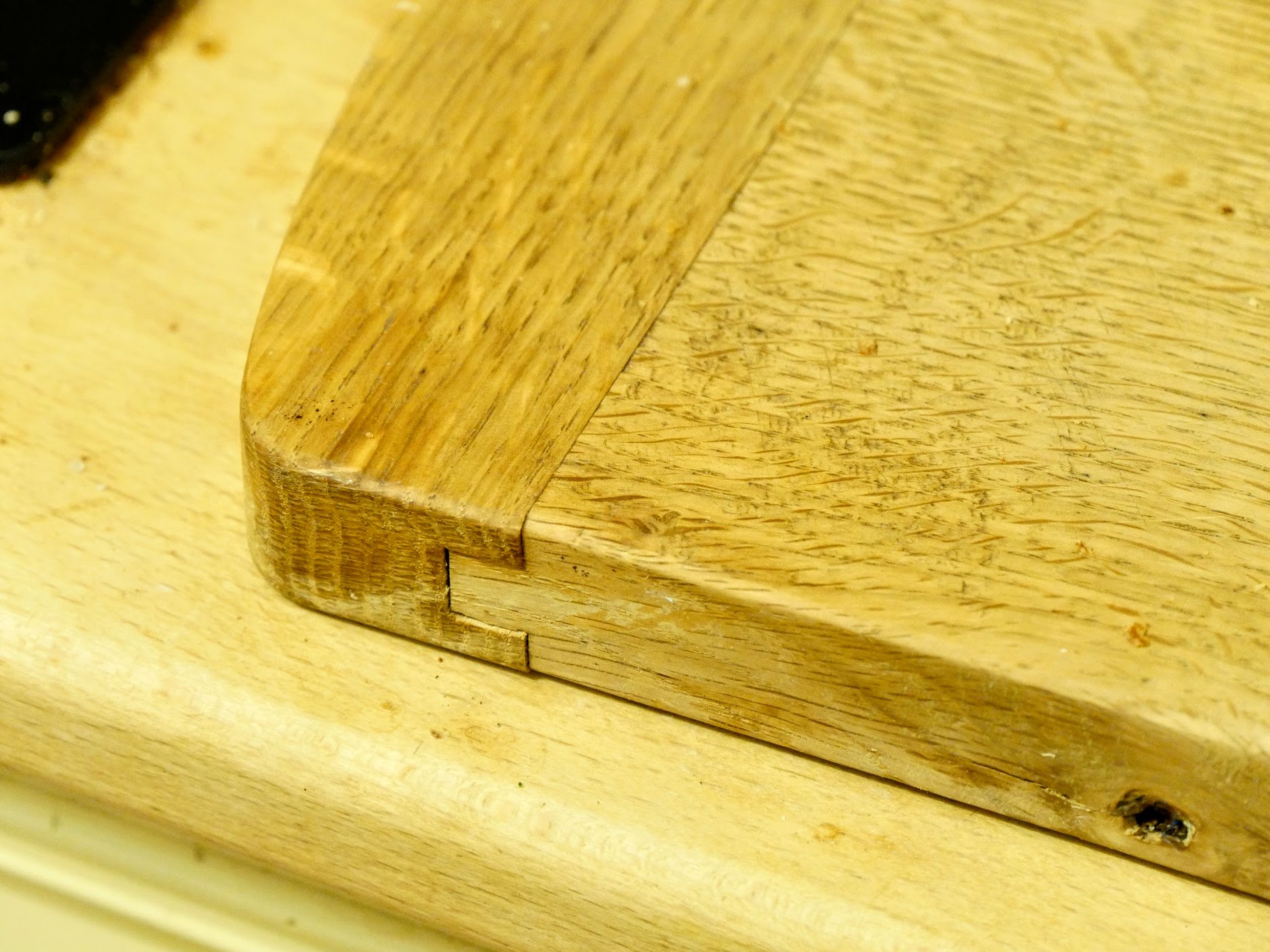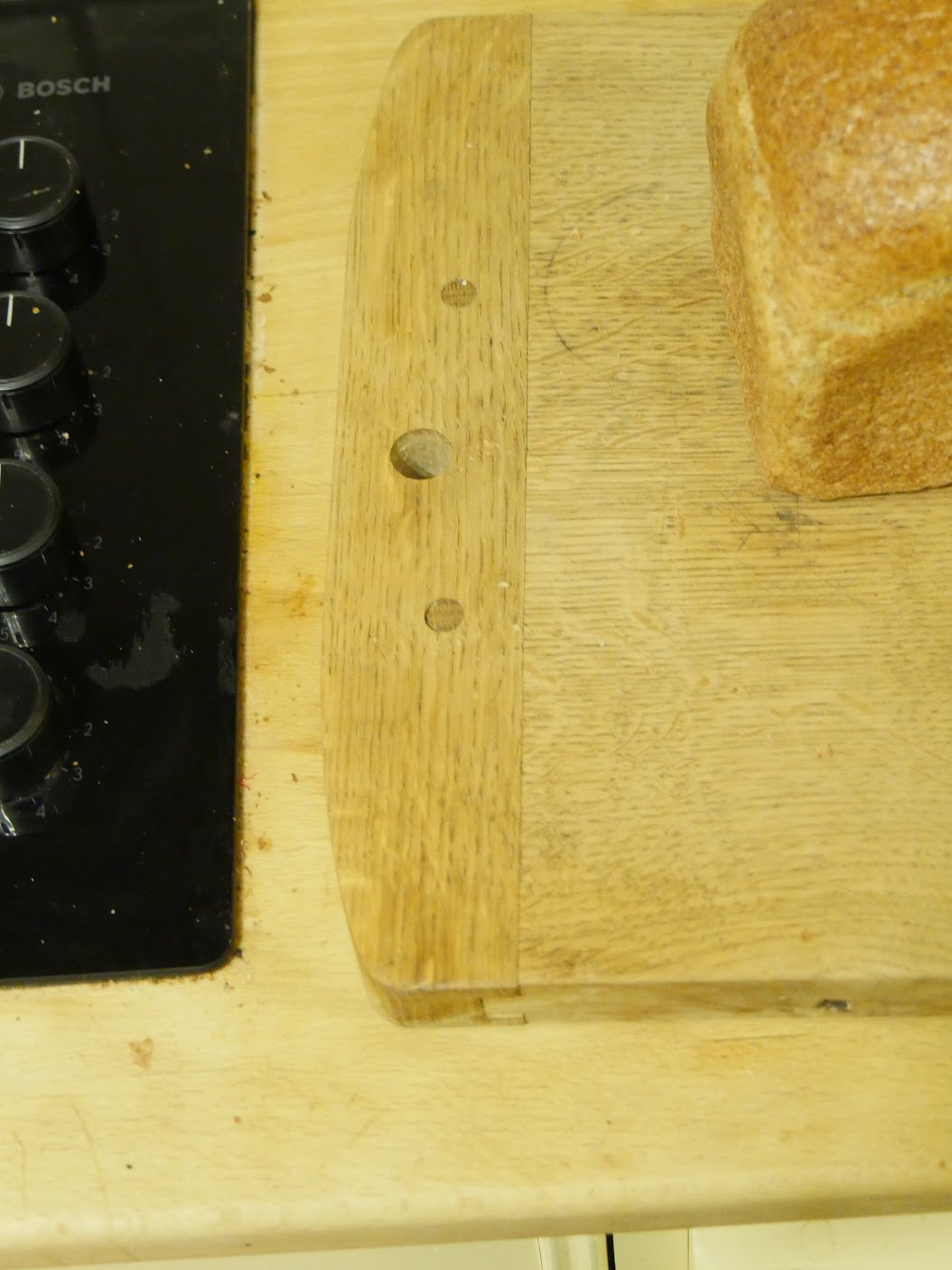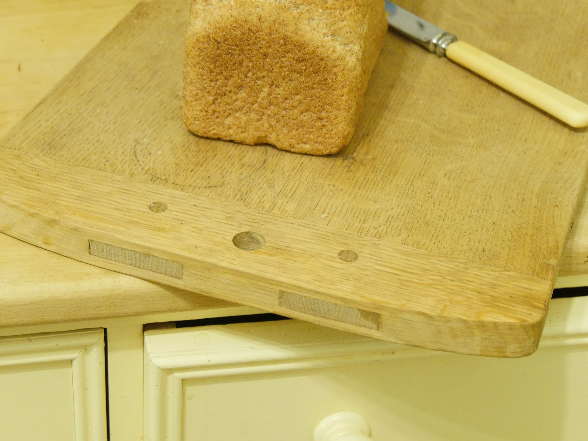 Back in 2007 I saw a breadboard platter in the Penrhyn Castle kitchens that really grabbed y attention for a few reasons. At first glance the breadboard might have been mistaken for, well, just a breadboard, but twin tenons through the breadboard end fascinated me because back in my apprenticeship we made some sycamore draining boards for a school kitchen we were refurbishing and we used the same method of diagonally offset draw-bore to unite the long edges and the breadboard ends. The thought of such work today doesn't bear thinking about but these things enriched my life. I made one of the breadboards for my own use and the result as both a breadboard cutting surface and a counter saver all in one has worked really well. There is no glue used along the breadboard ends but the whole thing has stayed together perfectly with no gapping along the long centreline. The main centre section has shrunk and expanded throughout its life but again no detriment at all to joint lines.