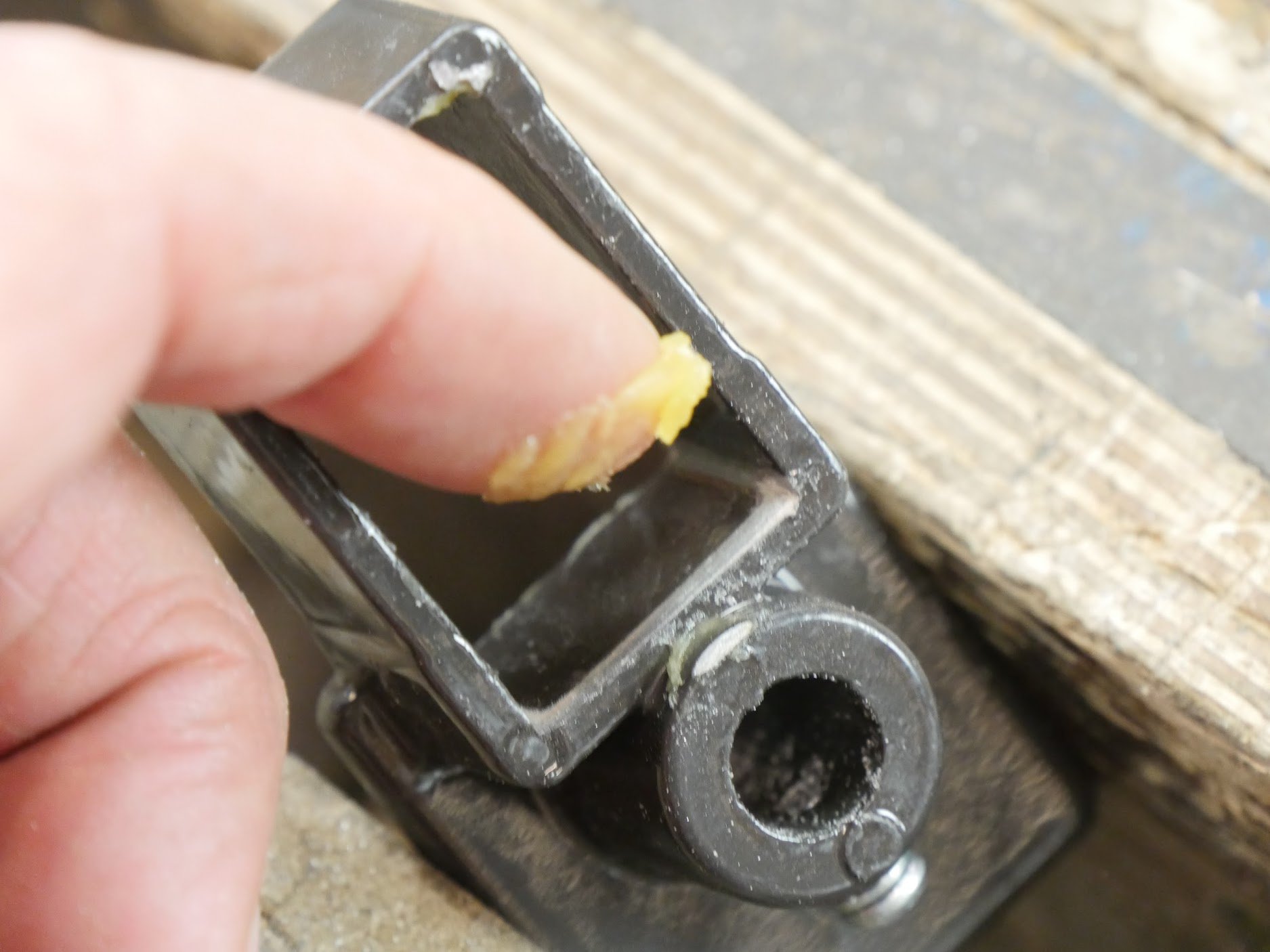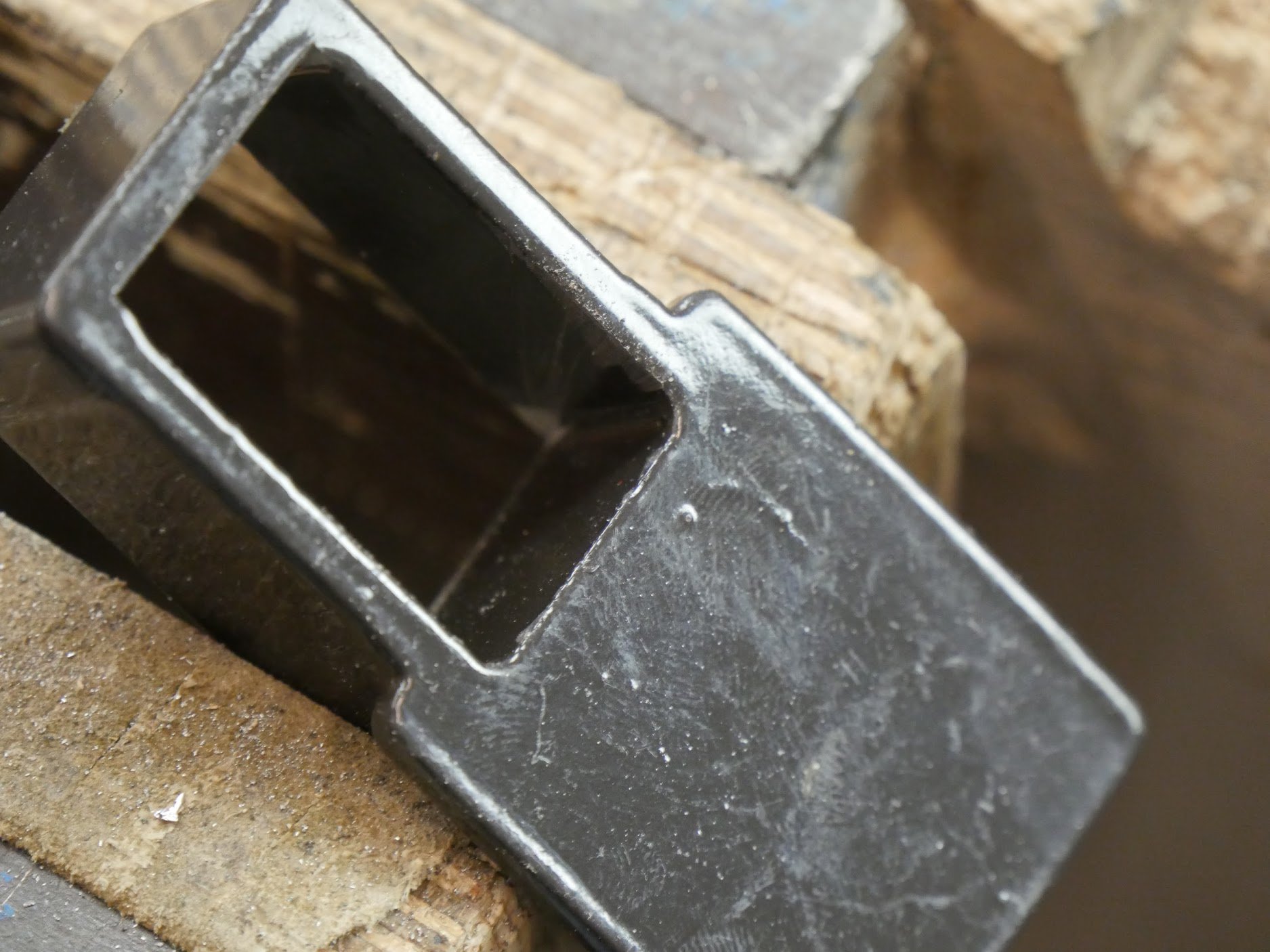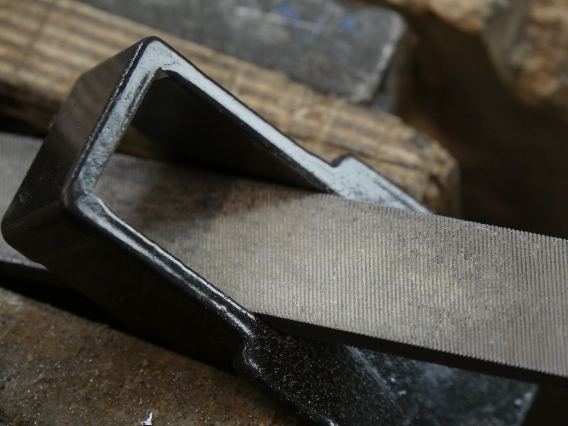 Step 2: With a flat file file the leading edges to each internal corner on the clamp head and shoe to create a round-over for a leading edge. Without this step the clamps bind too often for comfort and they are awkward when you least need it, which is usually during gluing up. Only do the edges in contact with the clamp bar and not the sides.