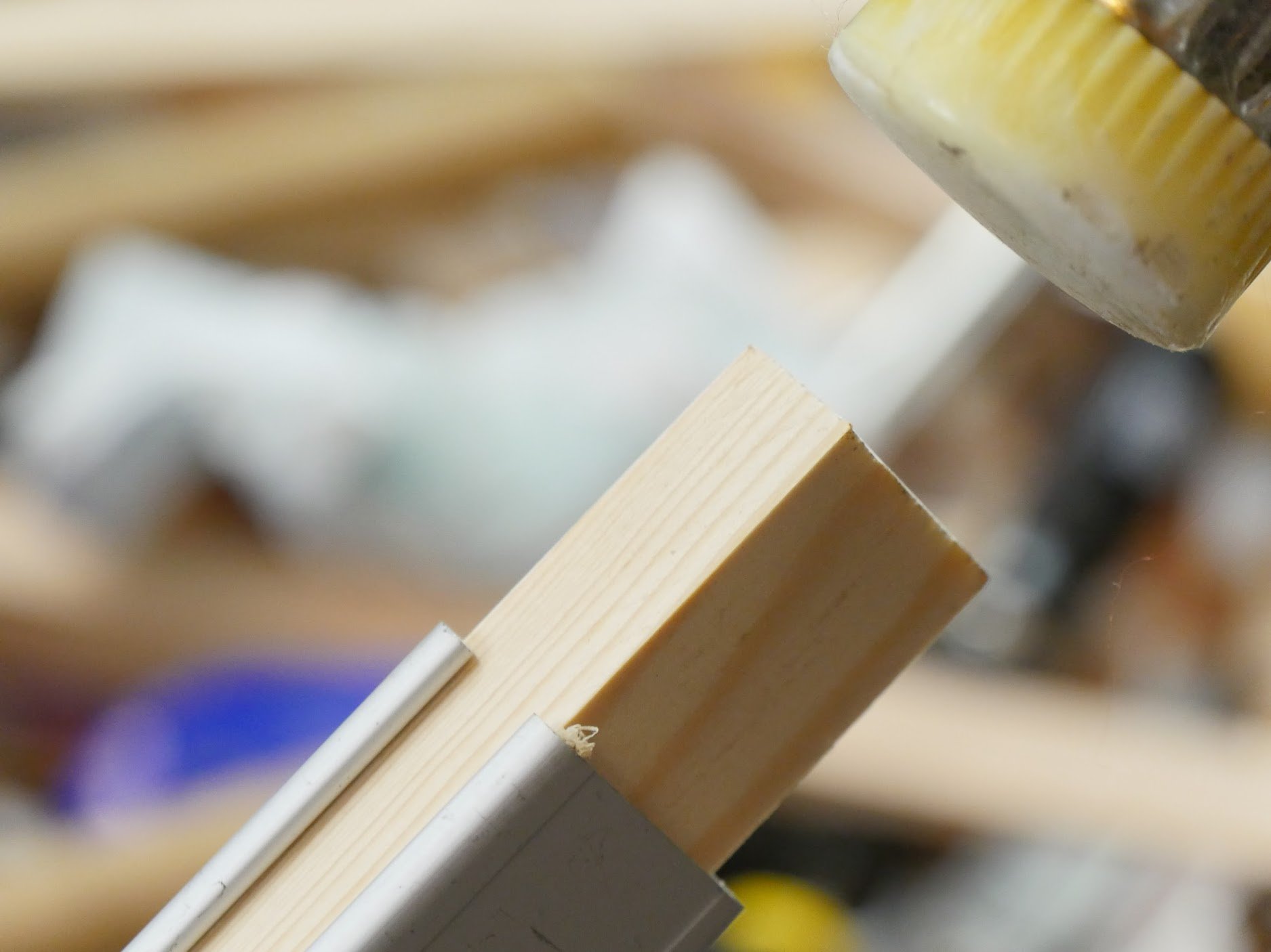 Step 4: Cut a 16mm by 25mm wooden stick to fit inside the aluminium extrusion the full length measured from the inside of the clamp head to the end of the square tube. Any wood type will do but try to choose straight grained stock as knotted or wiry grin can snap. You do not want a super-tight fit as it gets harder and harder to insert the deeper the wooden insert enters into the tube. Just a snug fit is best. It can get to point where it will neither enter further nor be withdrawn. Insert the section of wood and drive it home.